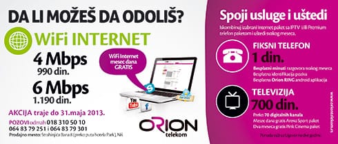 Promo tekstIskoristite priliku i do kraja maja po povoljnim cenama obezbedite WiFi Internet, IPTV ili Telefon. Popunjavanjem forme na kraju teksta ostvarujete određene pogodnosti.