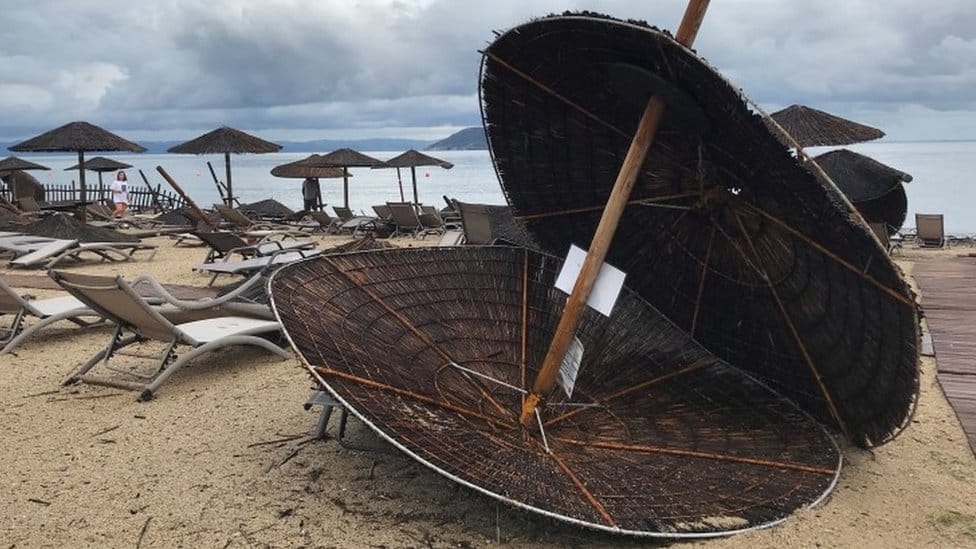 Rumunka i njeno dete su stradali kada se srušio krov restorana u Nea Plaji, navode zvaničnici, a Rus i njegov sin su stradali kada je palo drvo u blizini hotela u kom su bili smešteni.