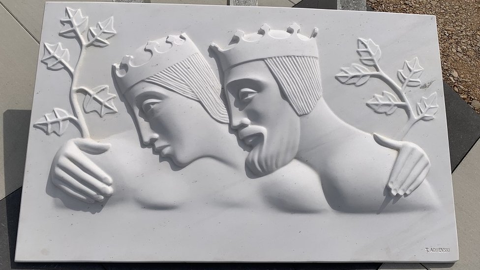 Spomen ploča Vladimira i Kosare u Baru, rad je makedonskog vajara Tometa Adzievskog