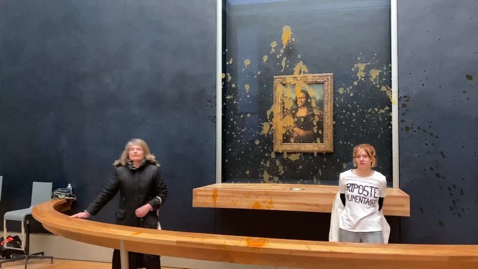 Dve demononstrantkinje su u nedelju, 28. januara prosule supu na zaštitno staklo ispod kojeg se nalazi slika Mona Lize u Parizu.