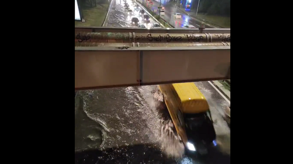 — Čarli Vafls (@CharlieWafflees)Saobraćaj zbog izlivanja kišne kanalizacije i plavljenja saobraćajnica, zaustavljen na uglu ulica Jurija Gagarina i Dr Ivana Ribara. Dosta automobila ostalo zaglavljeno u vodi.#blokovi #novibeograd pic.twitter.com/W9nv0wlioF