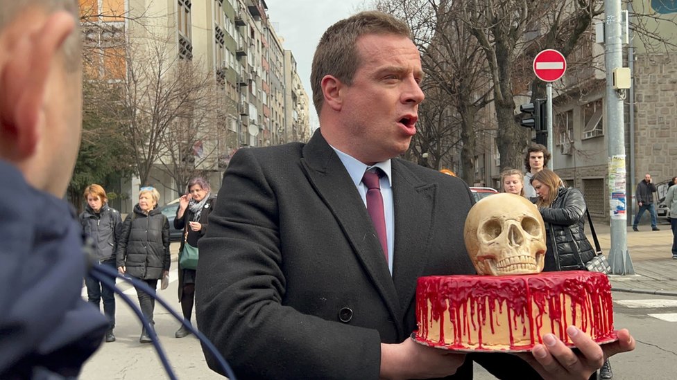 Desetak proukrajinskih aktivista u petak ujutru pokušali su da u ambasadi Rusije u Beograda predaju tortu sa maketom lobanje i crvenom glazurom nalik krvi.