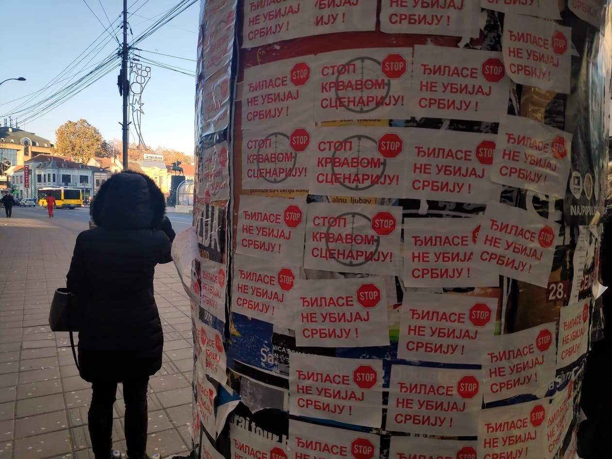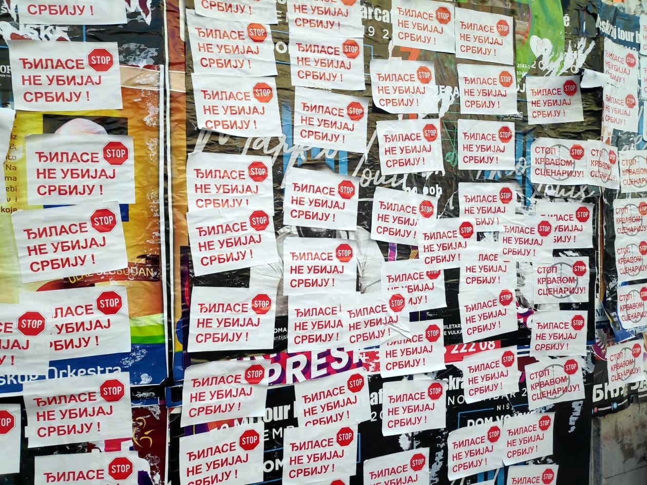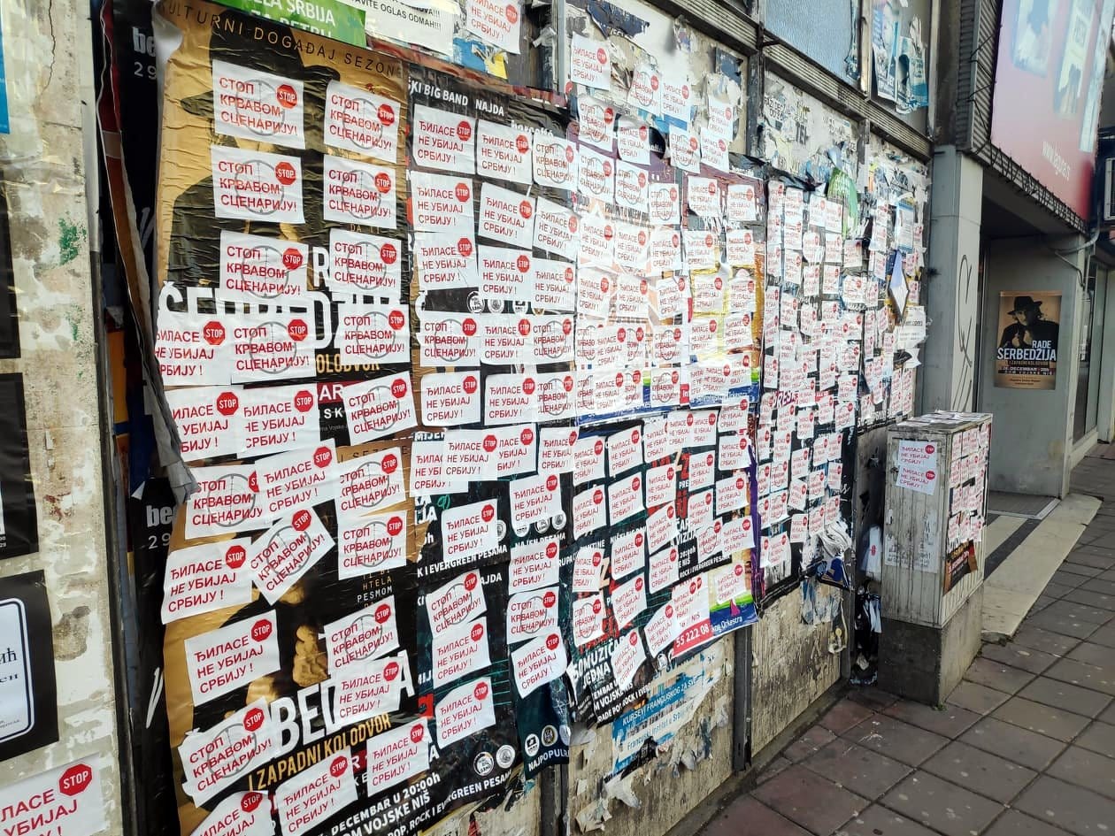 Svega nekoliko sati nakon priznanja Vučića da iza skupova koji su održani u Nišu, Leskovcu i Vranju stoji SNS i njegove molbe naprednjacima da se više ne okupljaju i sede kod kuće, osvanule su nalepnice sa porukom koja je bila i lajtmotiv pomenutih skupova.Crveno-bele nalepnice na kojima preko nacrtane mete stoji poruka „Đilase ne ubijaj Srbiju“ – prekrile su ulaze u podzemni prolaz na Trgu kralja Milana, gde je zabranjeno da se one lepe. Oblepljene su i na panoima za reklamiranje kraj autobuskog stajališta i prekrile su gotovo sve postere koji najavljuju koncerte u Nišu.