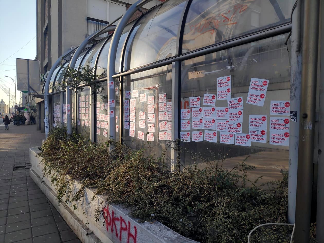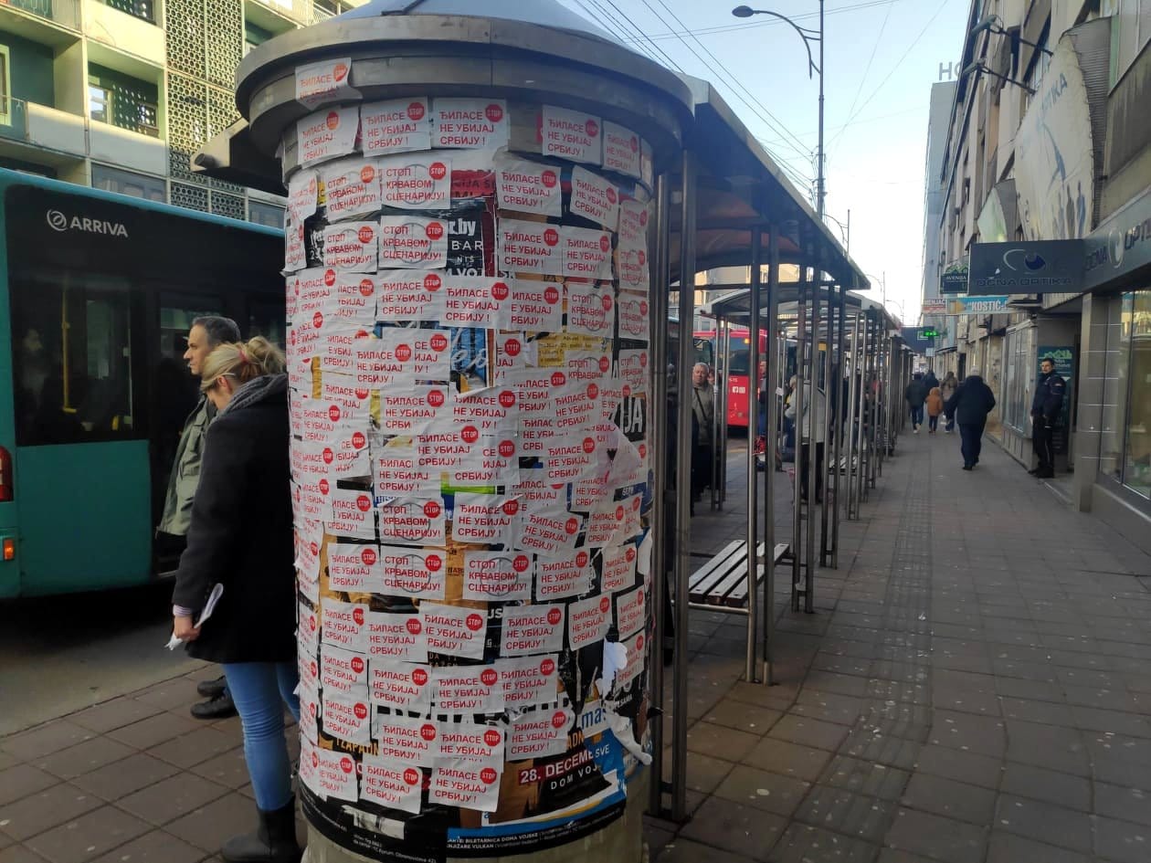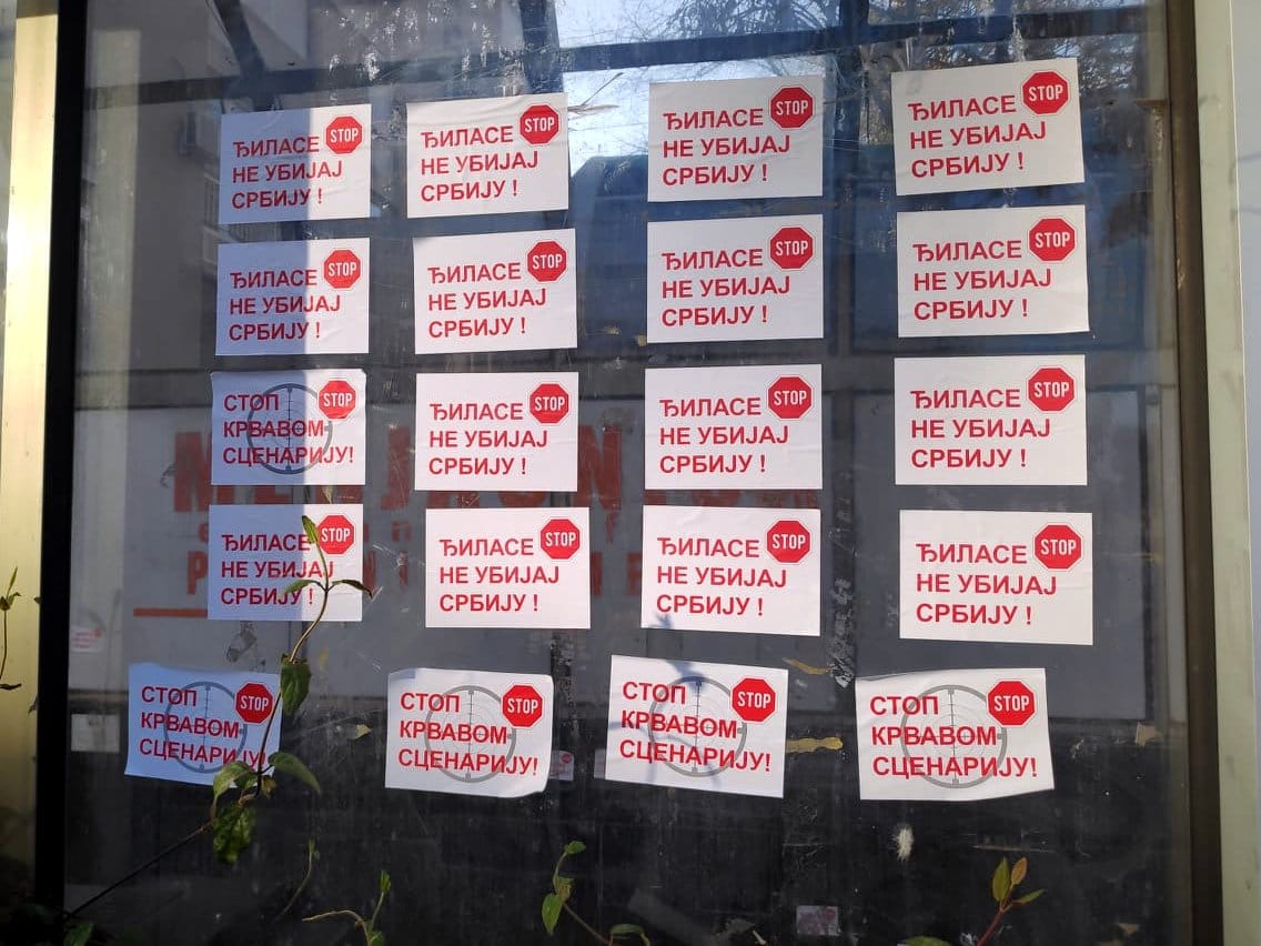 Svega nekoliko sati nakon priznanja Vučića da iza skupova koji su održani u Nišu, Leskovcu i Vranju stoji SNS i njegove molbe naprednjacima da se više ne okupljaju i sede kod kuće, osvanule su nalepnice sa porukom koja je bila i lajtmotiv pomenutih skupova.Crveno-bele nalepnice na kojima preko nacrtane mete stoji poruka „Đilase ne ubijaj Srbiju“ – prekrile su ulaze u podzemni prolaz na Trgu kralja Milana, gde je zabranjeno da se one lepe. Oblepljene su i na panoima za reklamiranje kraj autobuskog stajališta i prekrile su gotovo sve postere koji najavljuju koncerte u Nišu.