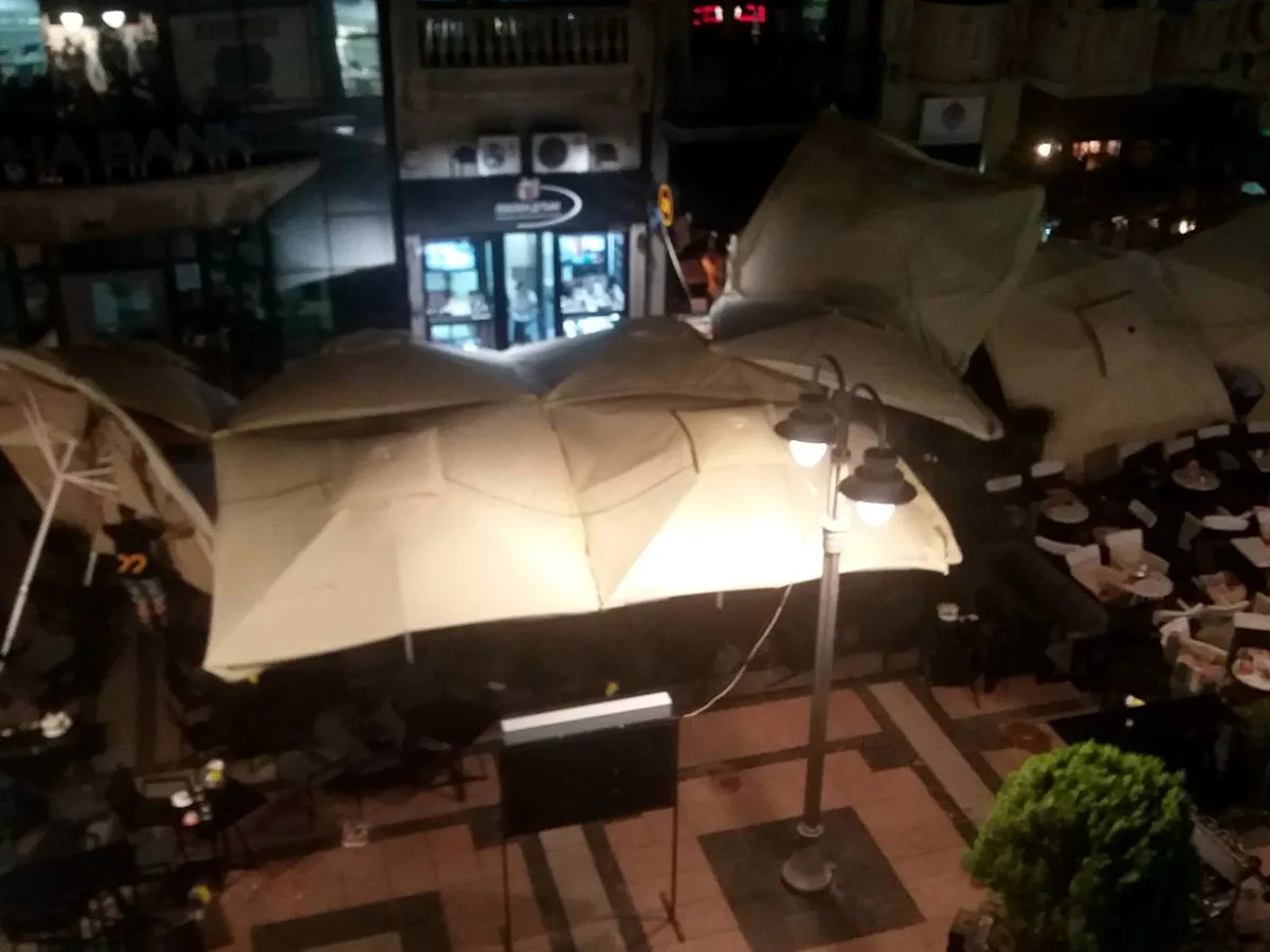 Izvrnuti suncobrani, razbacani meniji i podmetači sa stolova, i zaposleni koji pokušavaju da zadrže suncobrane ili jednostavno čekaju da se stiša vetar.Srećom sve je trajalo kratko, pa su tako i prve kapi kiše otišle s vetrom. Ipak, suvo vreme nakon brze oluje je kratko trajalo, a kiša je počela ponovo.