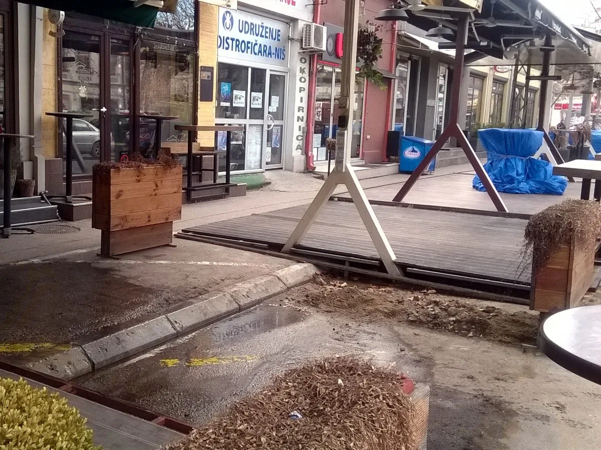 Komunalna inspekcija Opštine Medijana naložila je vlasnicima svih kafića na Trgu republike kod zgrade niške Uprave da uklone platforme za letnje baše kako bi ekipe Vodovoda mogle da poprave kvar i zaustave vodu koja otiče od juče.