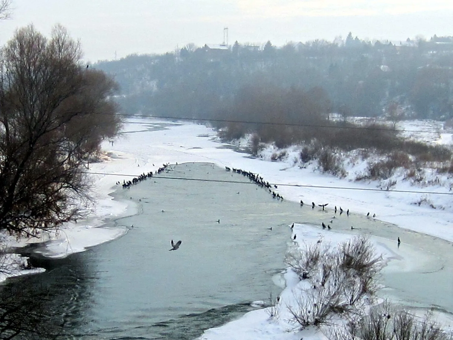 Na ledu koji se zbog niskih temperatura formirao na Južnoj Moravi, a može se videti sa Mramorskog mosta, okupilo se jato divljih pataka. Verovatno su svoje svakodnevno stanište zamenile privremenom “kućom”, jer su u potrazi za vodom i hranom.