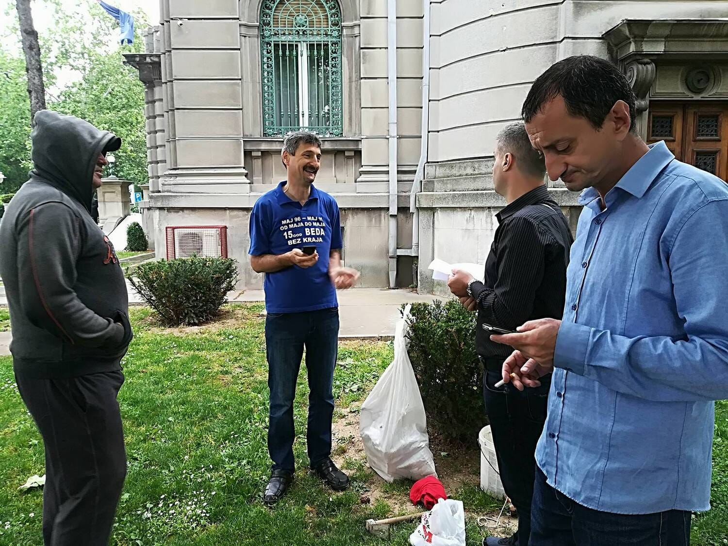 Upitan da prokomentariše da li je došao da spreči da se postave šatori kao Milan Đorđević ili kao komunalni policajac, s obzirom na to da je došao u civilu, kaže da je došao „da im skrene pažnju“.