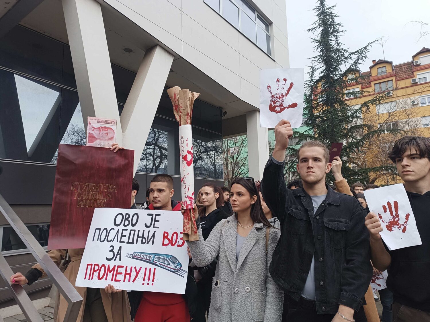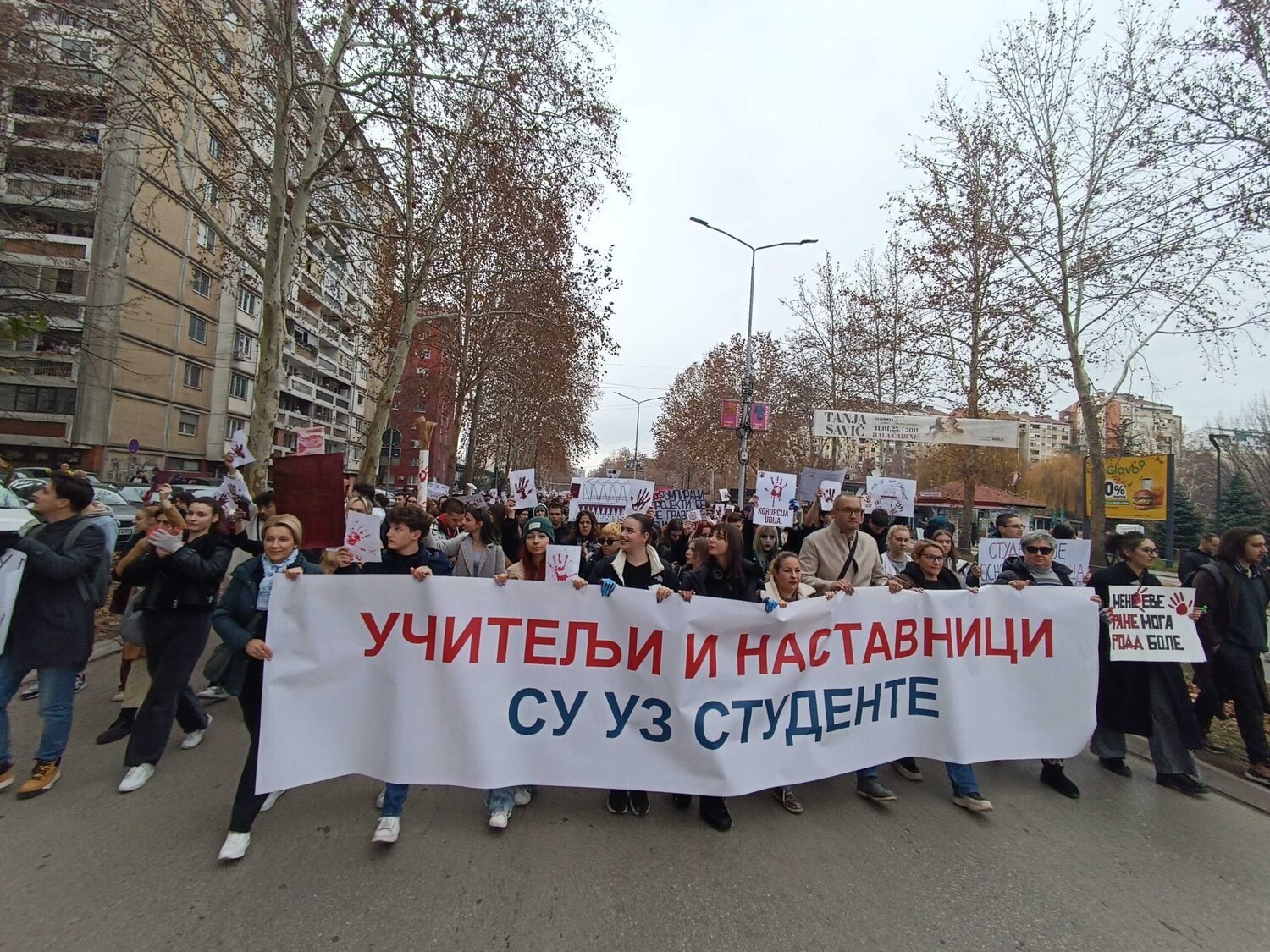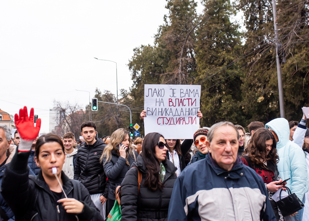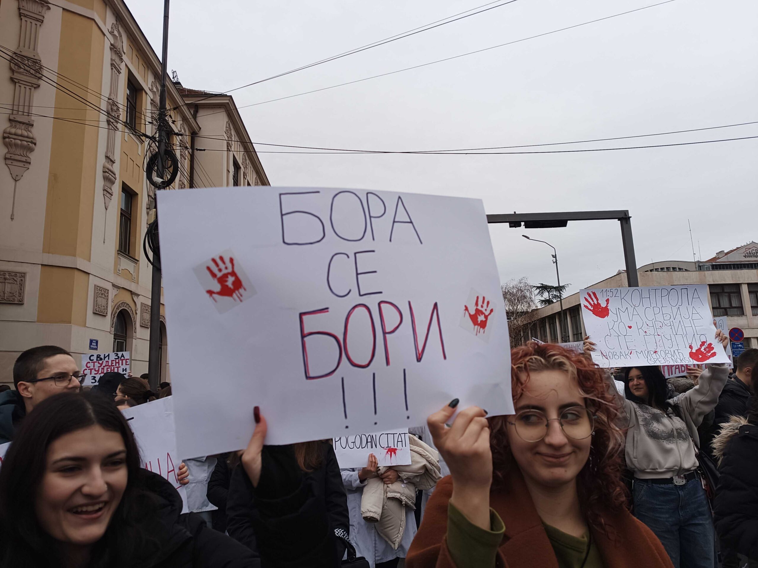 Blokada raskrsnice kod Osnovnog suda trajala je danas od 11:52 do 12:07, a onda su brojni okupljeni krenuli u protestnu šetnju Bulevarom dr Zorana Đinđića do prostorija Srpske napredne stranke, gde si zalepili otiske krvavih ruku.„Učitelji i nastavnici su uz studente“, „Nemamo mi šta da se skupljamo, mi smo se ovde raširili. I tako ćemo se širiti i širiti“, „Bora se bori“, „Korupcija ubija“, „Krivi smo mi koji smo ćutali“, „Budimo realni, tražimo ostavke“, „Ne bi bilo ove krvi da je bilo sve po zakonu“, „Korupcija ubija“, „Mene sve rane moga roda bole“ – neki su od transparenata koje su okupljeni nosili ovog petka.
