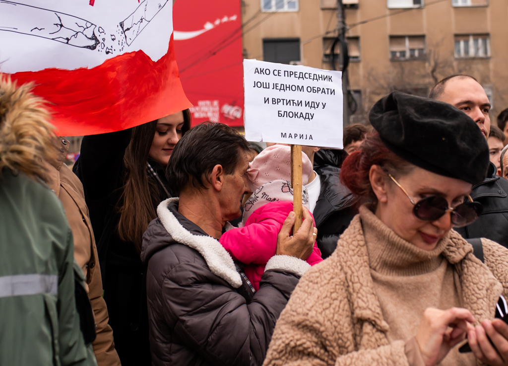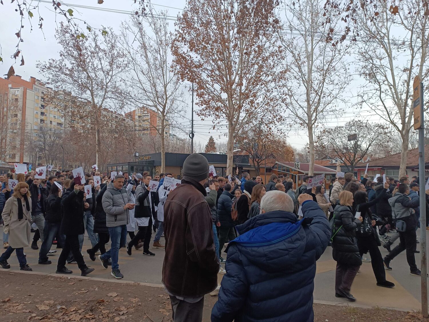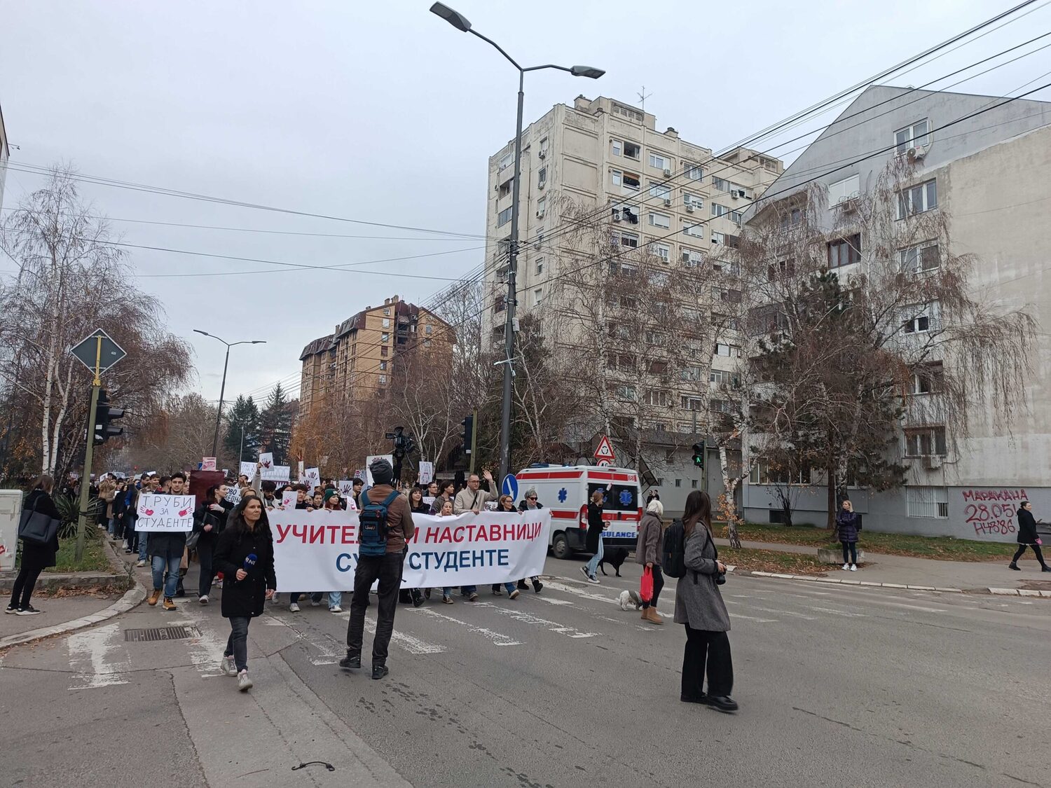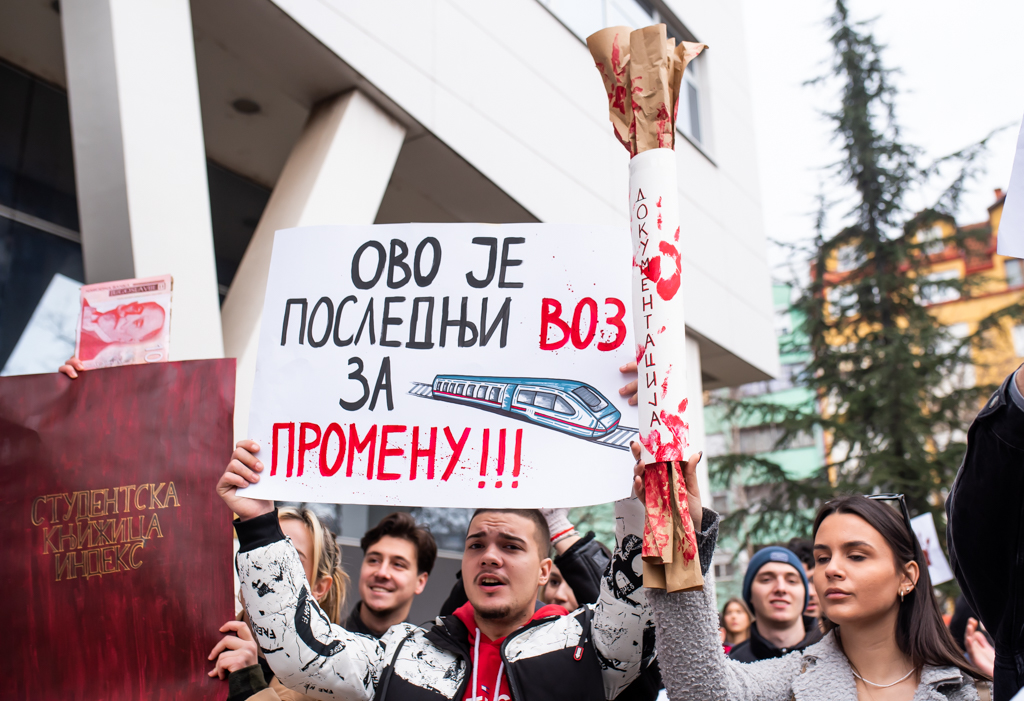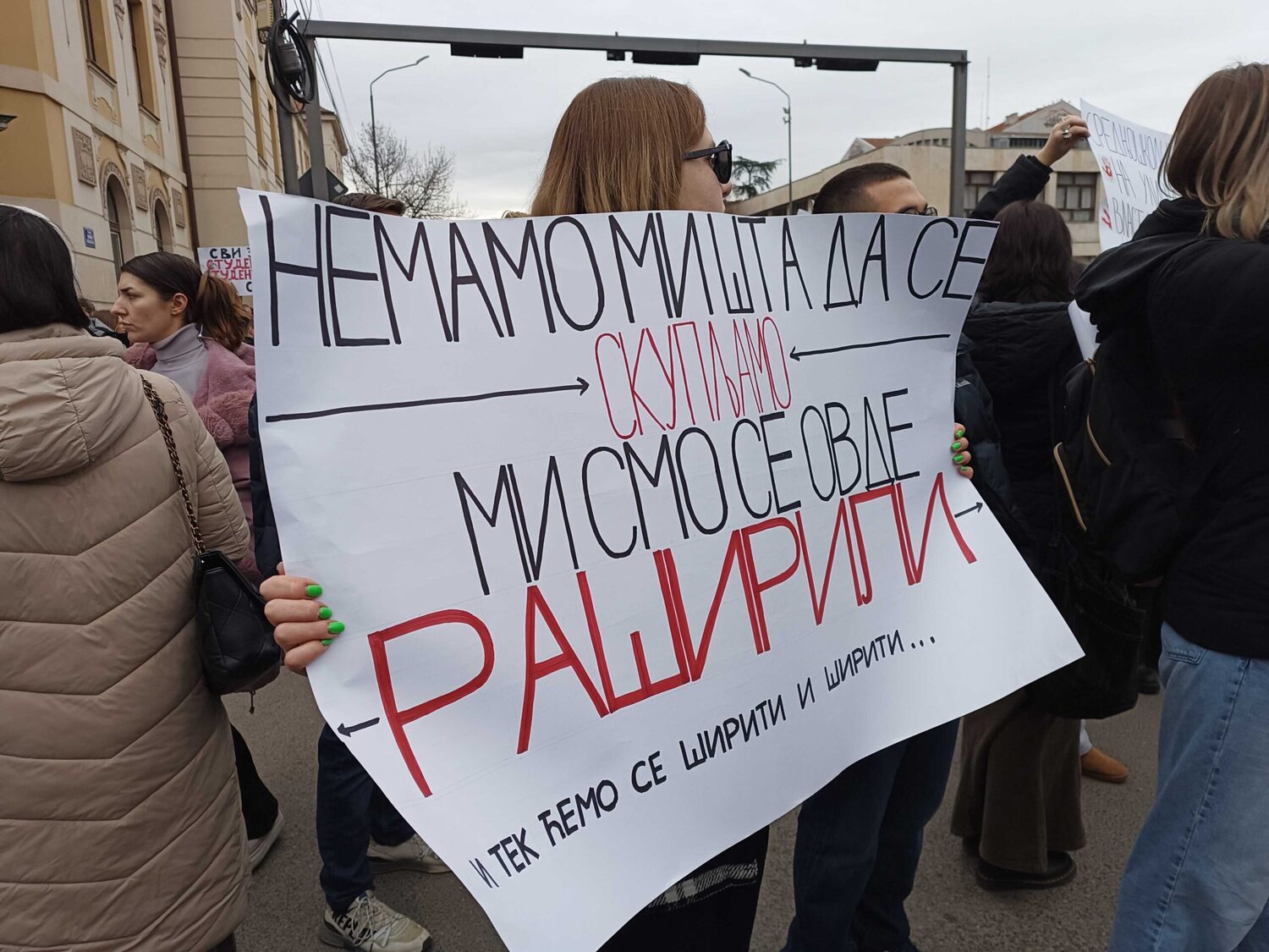 Blokada raskrsnice kod Osnovnog suda trajala je danas od 11:52 do 12:07, a onda su brojni okupljeni krenuli u protestnu šetnju Bulevarom dr Zorana Đinđića do prostorija Srpske napredne stranke, gde si zalepili otiske krvavih ruku.„Učitelji i nastavnici su uz studente“, „Nemamo mi šta da se skupljamo, mi smo se ovde raširili. I tako ćemo se širiti i širiti“, „Bora se bori“, „Korupcija ubija“, „Krivi smo mi koji smo ćutali“, „Budimo realni, tražimo ostavke“, „Ne bi bilo ove krvi da je bilo sve po zakonu“, „Korupcija ubija“, „Mene sve rane moga roda bole“ – neki su od transparenata koje su okupljeni nosili ovog petka.