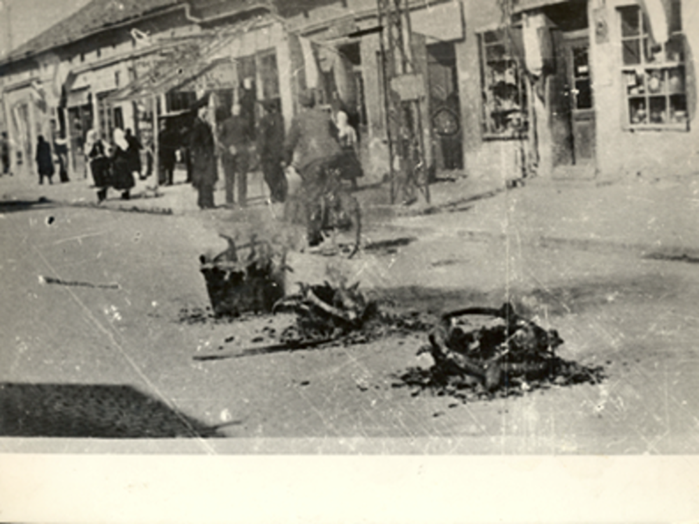 Ispred zgrade Radničke komore, demonstranti su izneli iz radnje Čede Stamenkovića, trgovca, tri bureta katrana i preko njih namestili osovinu i sve to spalili, želeći da simbolično zapale Osovinu Rim-Berlin-Tokio – navode oni.