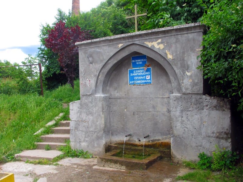 Nije ova cesma u crkvi, nego u jednoj ulicici ispod crkve, samo je po crkvi nazvana. Mada svejedno su somovi ovi sto peru vozila tu