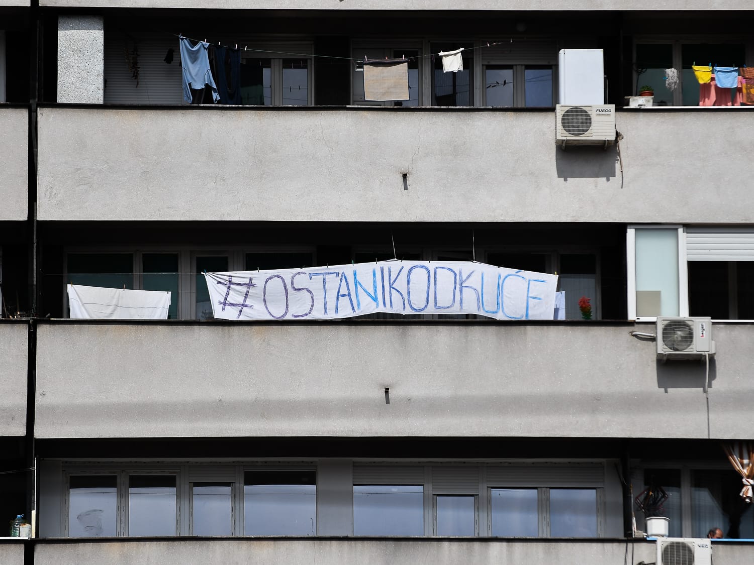 Dok mnoge poznate ličnosti na društvenim mrežama apeluju da građani ostani u svojim domovima dok traje pandemija korona virusa, jedan Nišlija je ovu poruku poslao na originalan način – na platnu dugom nekoliko metara napisao je #OstaniKodKuće i to okačio na svoju terasu.