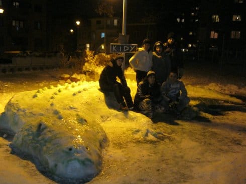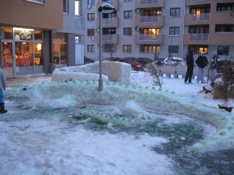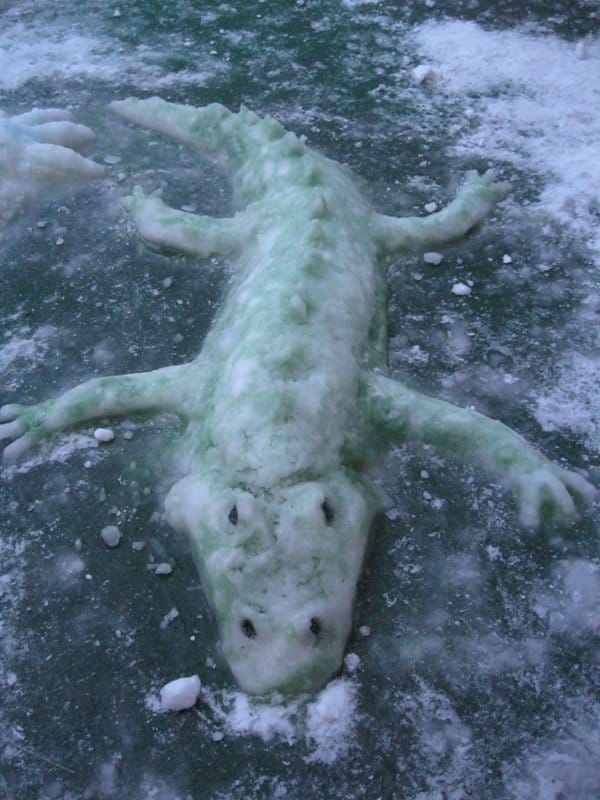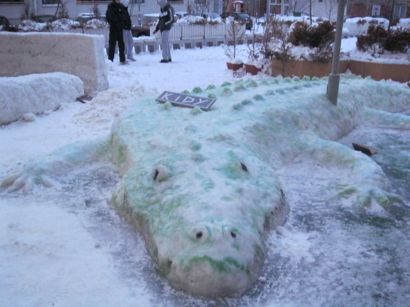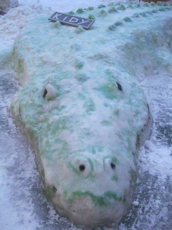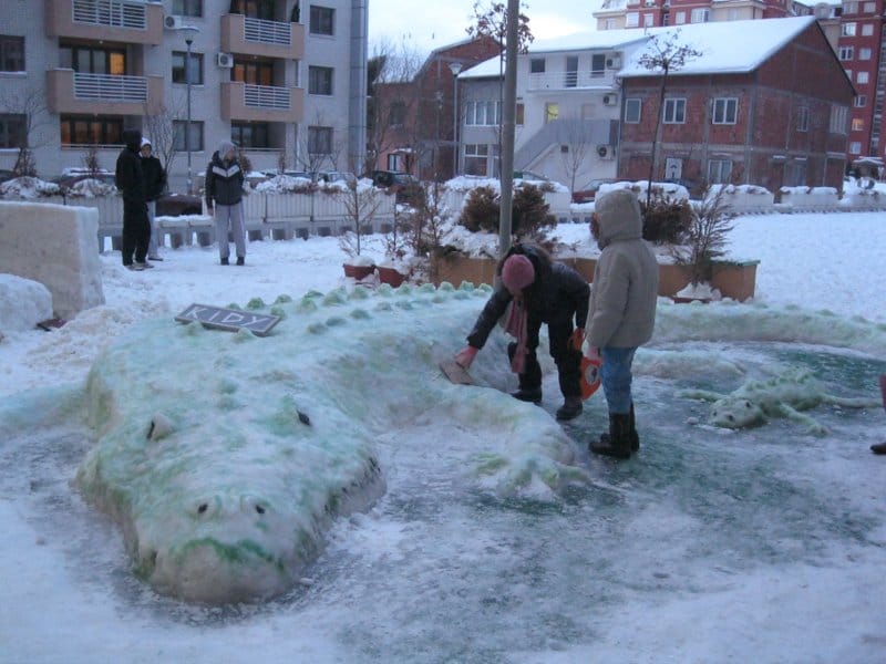 Krokodilima Kidi i Roki, skulpturama od snega, pridodata je još jedna figura. Kako saznaju Južne vesti, reč je o velikom šanku i čoveku.