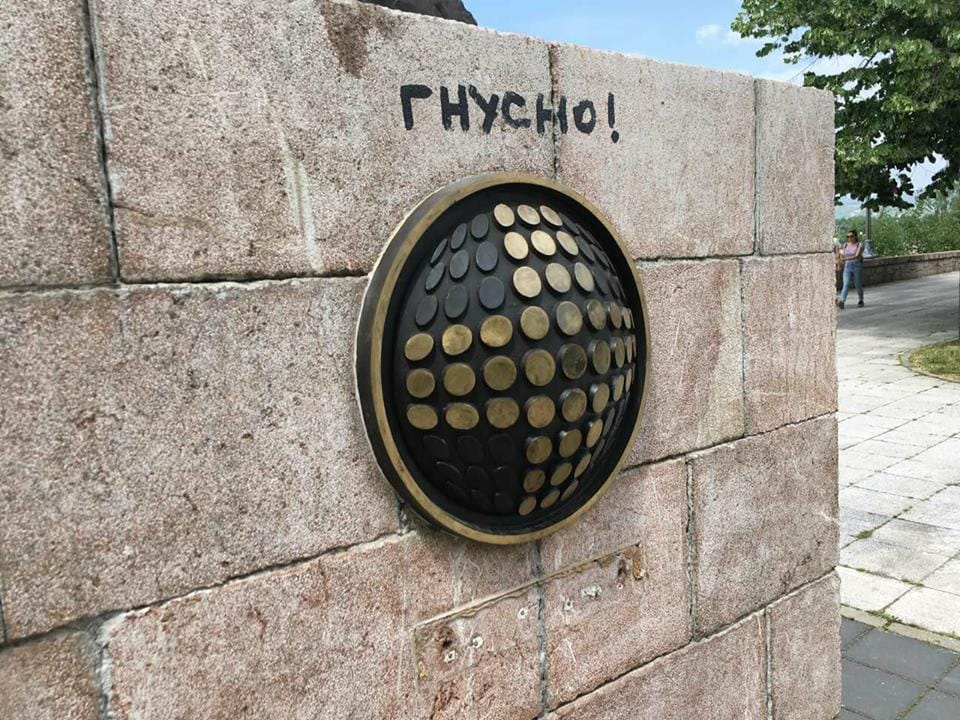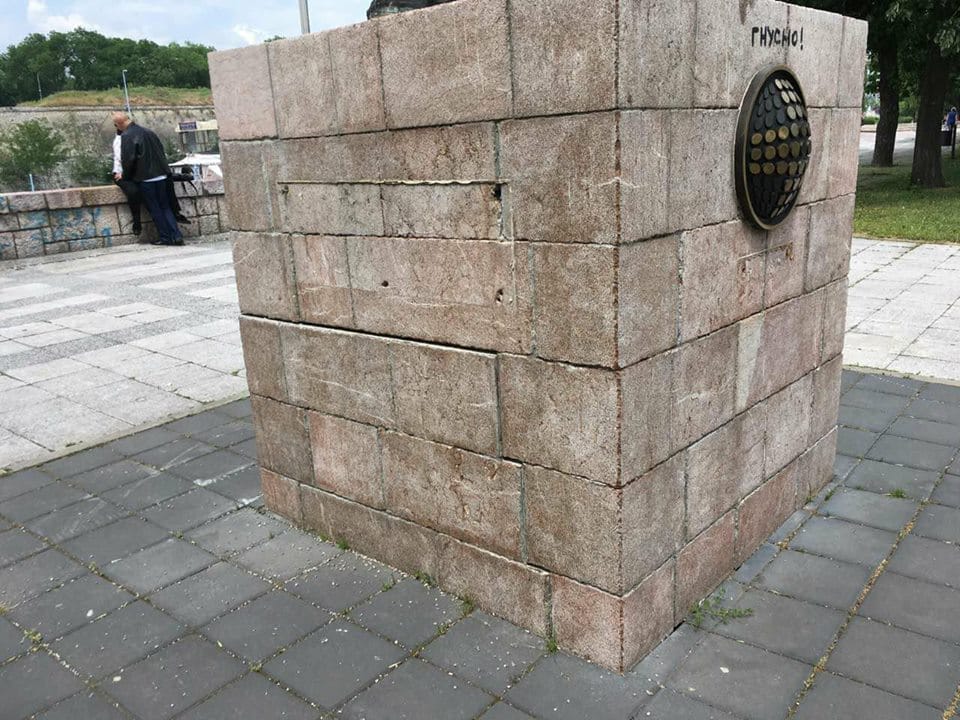 Taj natpis stoji na spomeniku vec duze vreme. Ne podrzavam vandalizam ali da je spomenik gnusan – gnusan je.