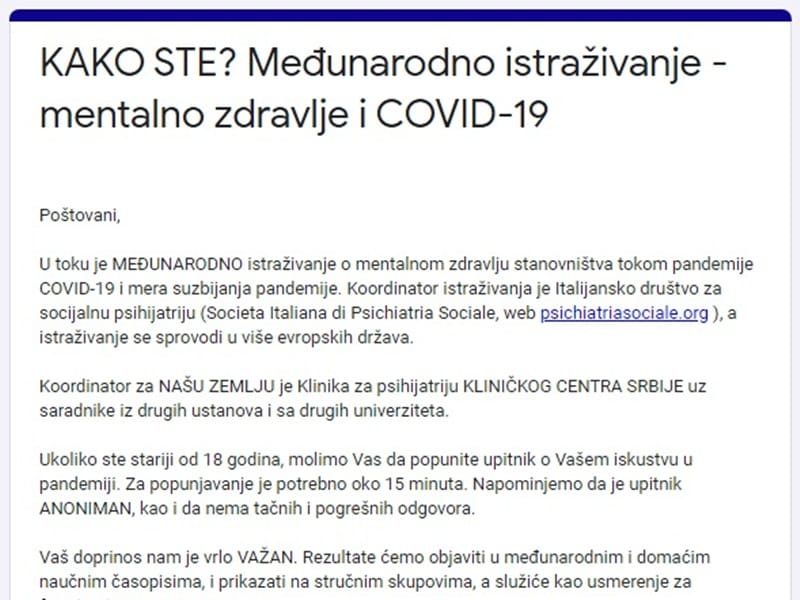 U toku je međunarodno multicentrično istraživanje o mentalnom zdravlju stanovništva tokom pandemije. Koordinator istraživanja je Italijansko društvo za socijalnu psihijatriju, a istraživanje se sprovodi u više evropskih država. Istraživanje se sprovodi pod naslovom “COVID-19 i mentalno zdravlje: Evropska opservaciona multicentrična studija”. Molimo vas da popunite upitnik i time date značajan doprinos sagledavanju navedenog problema i kreiranju mera pomoći – kažu organizatori.