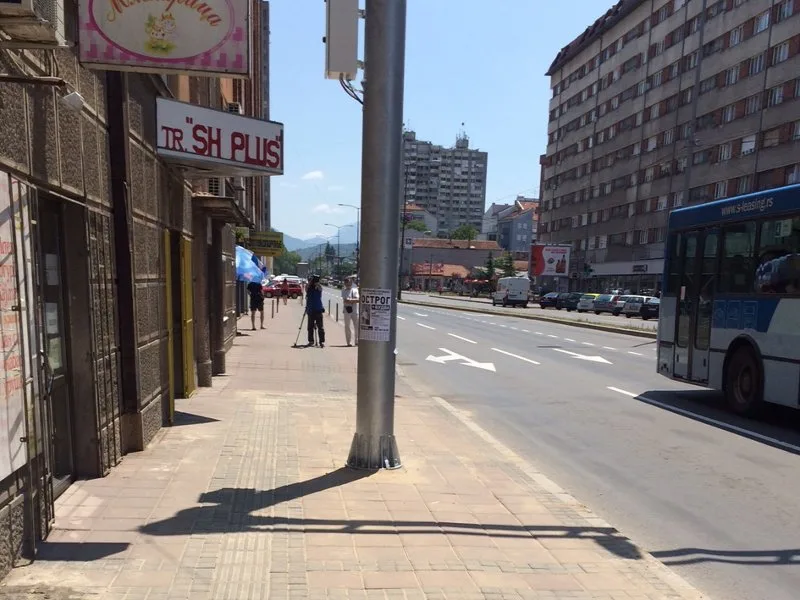 A ako pratite stazu za slepe prema Lutkarskom pozoristu ona ulazi u parking, pa ta staza i nema neki smisao. Od Pevca do Suda te staze uopste i nema. Ni ispred Lutkarskog pozorista je nema. Vrlo korisna stvar. A zasto li nije mogla jedna kamera da snima sve 3 trake u jednom smeru? Onda bi imali 4 kamere umesto 12. I manji stub. Koja je to tezina koju on mora da drzi?