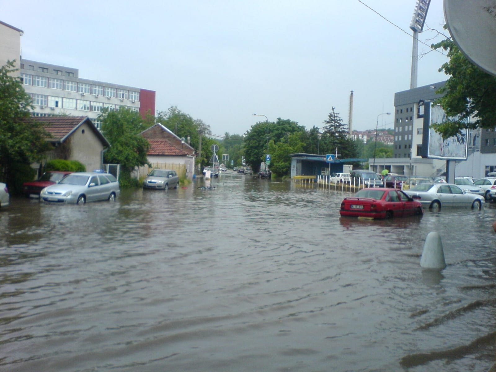 12. Bulevar Nemanjića nije mogao da se pređe od kružnog toka kod Doma Zdravlja pa sve do bulevarske pijace, jer je cela ta traka za pravac ka pijaci bila potopljena. Videlo se kako je tekla reka prema DZ.