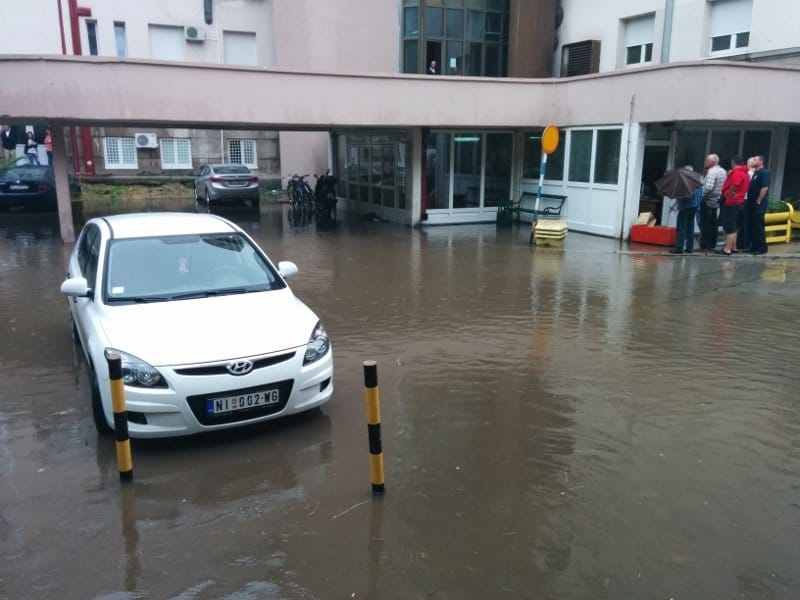 Jak pljusak koji je zadesio Bulevar Nemanjića i centar Niša, osim nekih ulica poplavio je i Klinički centar gde se jedan radnik, u pokušaju da izbaci vodu iz zgrade hirurgije, ozbiljno povredio.