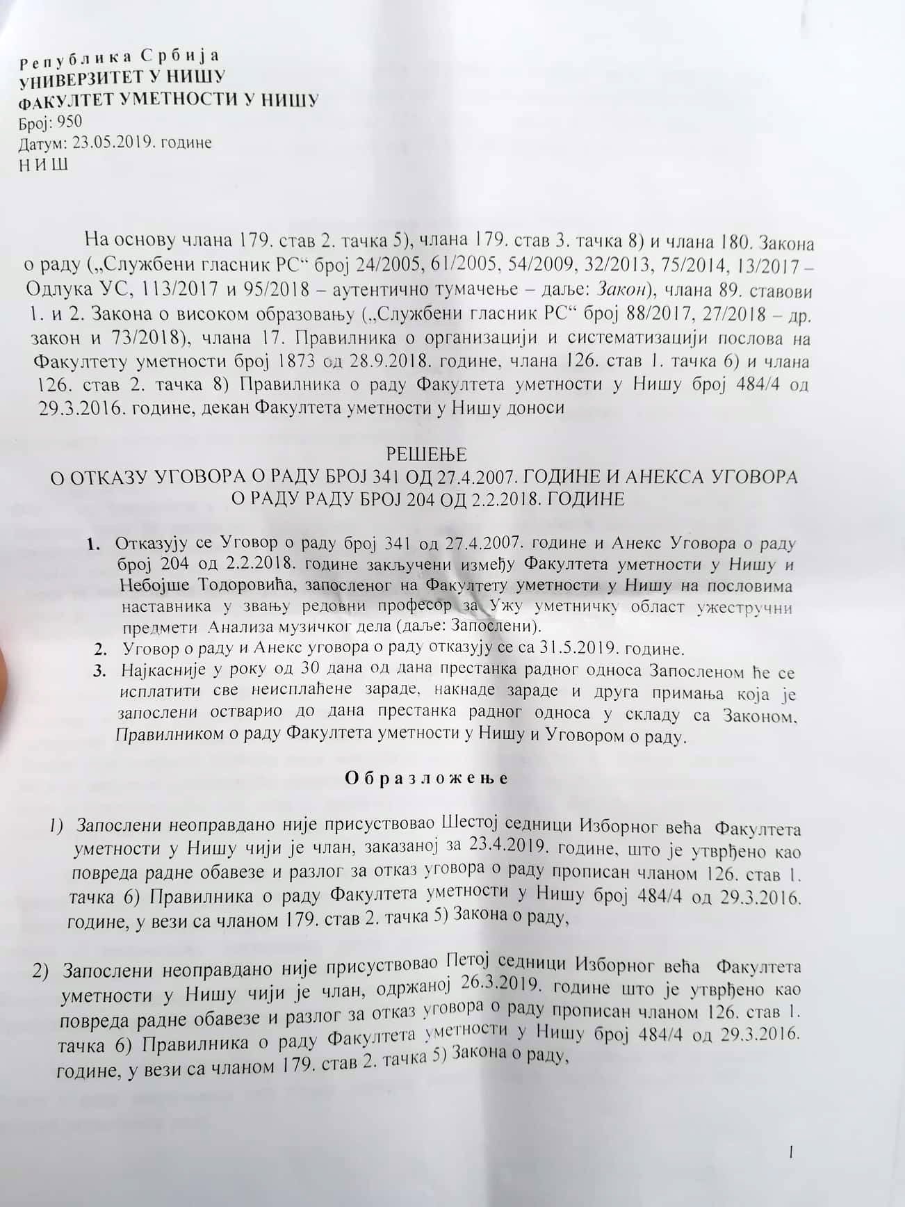 U obrazloženju stoji da sam otpušten, jer nisam bio na tri poslednje sednice Izbornog veća, koje nisu ni održane jer nije bilo kvoruma. Piše da sam ja morao da dođem na te sednice jer je to moja radna obaveza. Međutim, ja sam sudskom odlukom vraćen na radno mesto redovnog profesora za predmet analiza muzičkog dela, ali dekan nije ispoštovala tu odluku iako smo potpisali aneks ugovora. Ona je iznad suda i ja nisam radno angažovan. Ja ne mogu malo da radim, malo da ne radim – na sednice da dolazim, a na nastavu koja je primarna ne – pojašnjava Todorović.