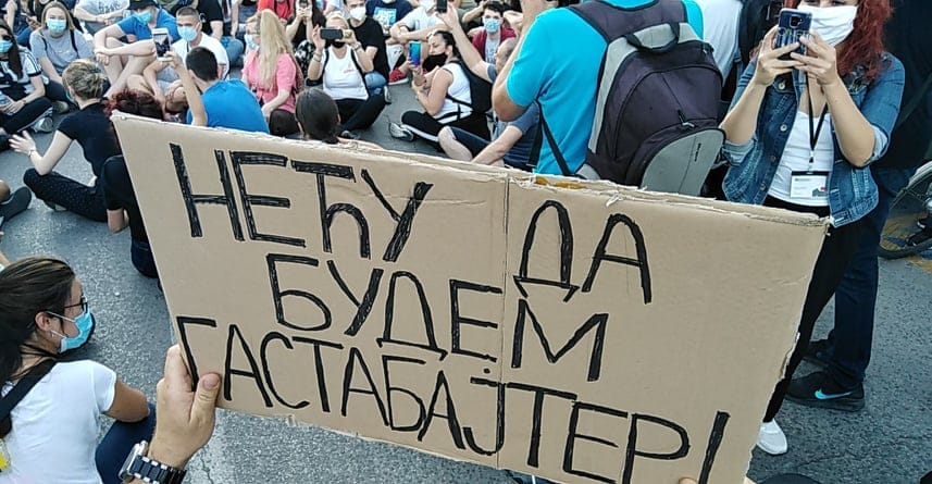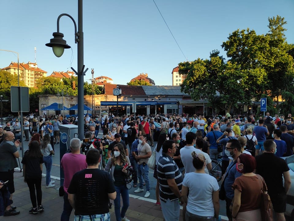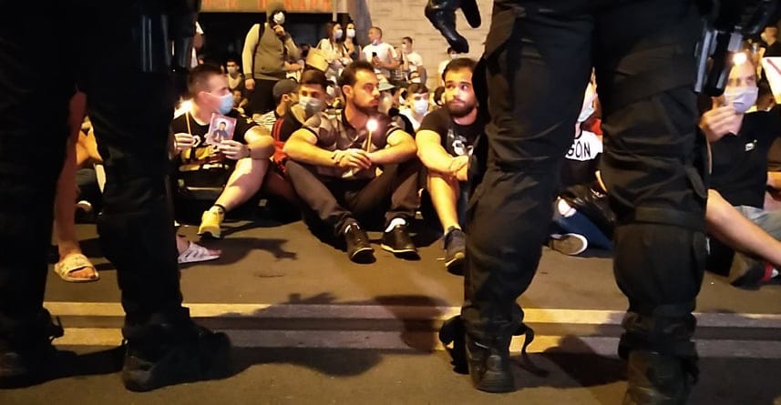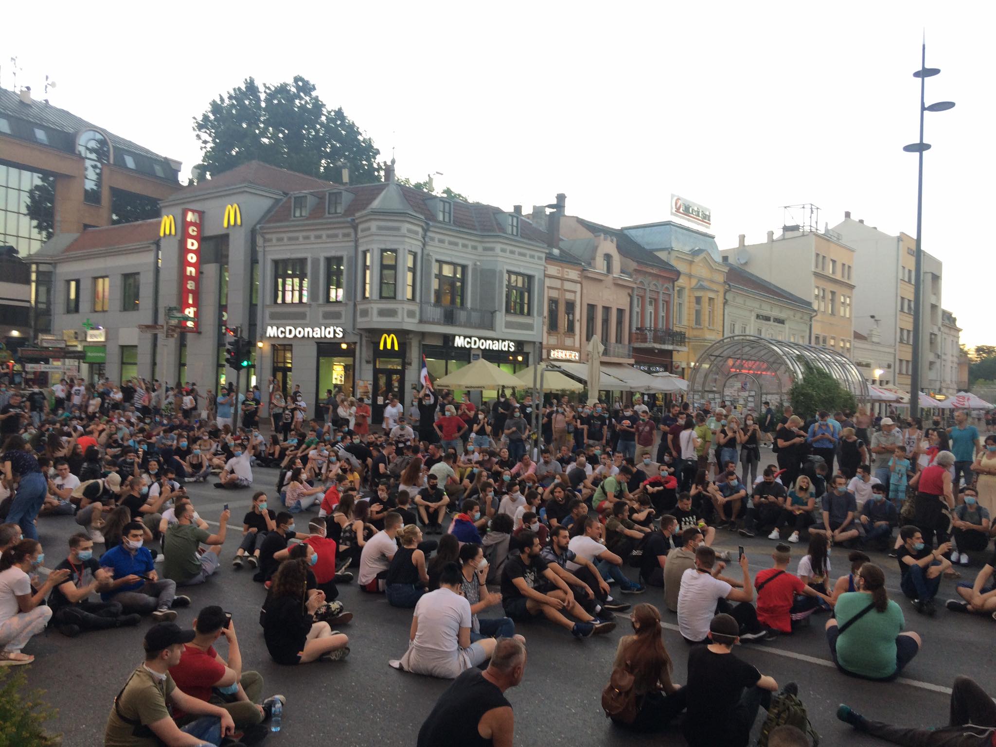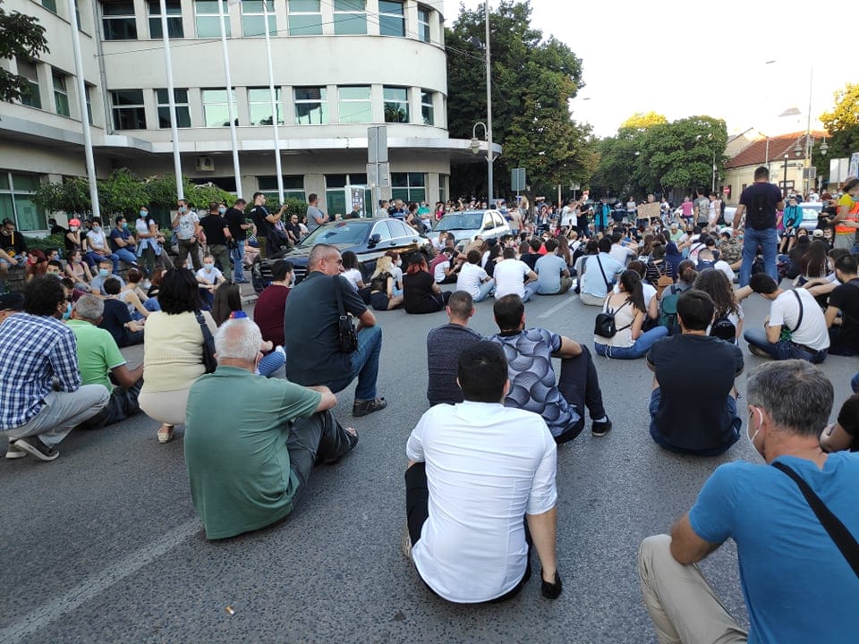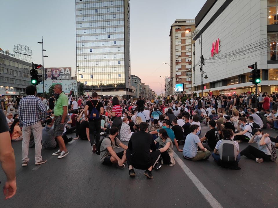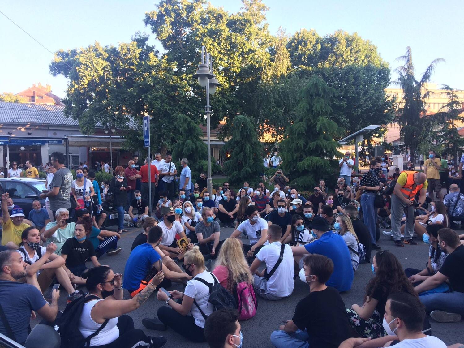 20:14 – Demonstranti stigli na Trg kralja Milana i seli na zemlju u znak protesta.