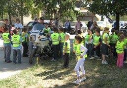 Predstavnici Metroparking jug i saobraćajne policije uručili su 106 prsluka, ali je najmlađe učenike Osnovne škole „Trajko Stamenković“ veoma zanimala saobraćajna vozila.