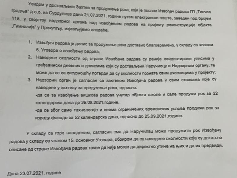 Ako sve bude po planu, Milan Aranđelović, gradonačelnik Prokuplja, ističe da će manje nepravilnosti firme Tončev gradnja, kojoj su povereni radovi vredni oko 306 miliona dinara finansirani preko Kancelarije za javna ulaganja, do tada biti otklonjene, čime bi se stekli uslovi da se od polugodišta đaci vrate u sređene i moderno opremljene učionice.