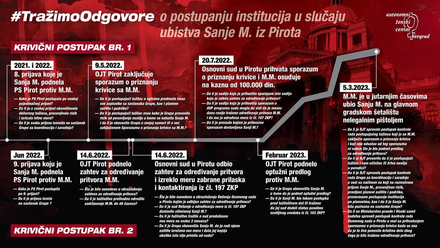 U Srbiji su od početka 2023. godine ubijene 22 žene, 2 devojčice i 1 transdevojka, podaci su Autonomnog ženskog centra (AŽC). Jedna od njih je i S. M. iz Pirota, koju je ubio njen bivši vanbračni partner M. M, i to nakon što ga je 9 puta prijavljivala nadležnima, pa su mnogi postavili pitanje da li su institucije zakazale. Iz AŽC-a kažu ih zabrinjava veliki broj ubijenih žena koje nisu ranije prijavile nasilje, jer nisu imale poverenje da će ih institucije zaštititi.