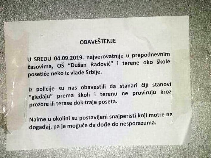 Iz policije su nas obavestili da stanari čiji stanovi “gledaju” prema školi i terenu ne proviruju kroz prozor ili terase dok traje poseta. Naime, u okolini su postavljeni snajperisti koji motre na događaj – jedno je od obaveštenja.