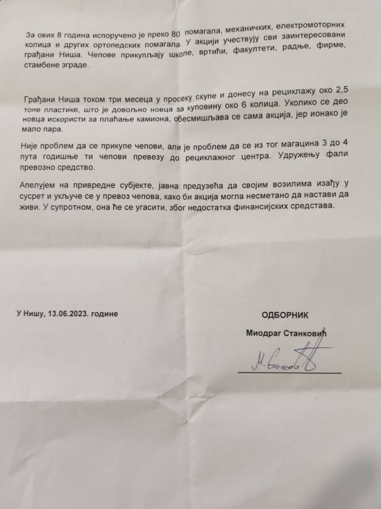 Apelujem na privredne subjekte, javna preduzeća da svojim vozilima izađu u susret i uključe se u prevoz čepova, kako bi akcija mogla nesmetano da nastavi da živi. U suprotnom, ona će se ugasiti, zbog nedostatka finansijskih sredstava – naveo je Stanković.