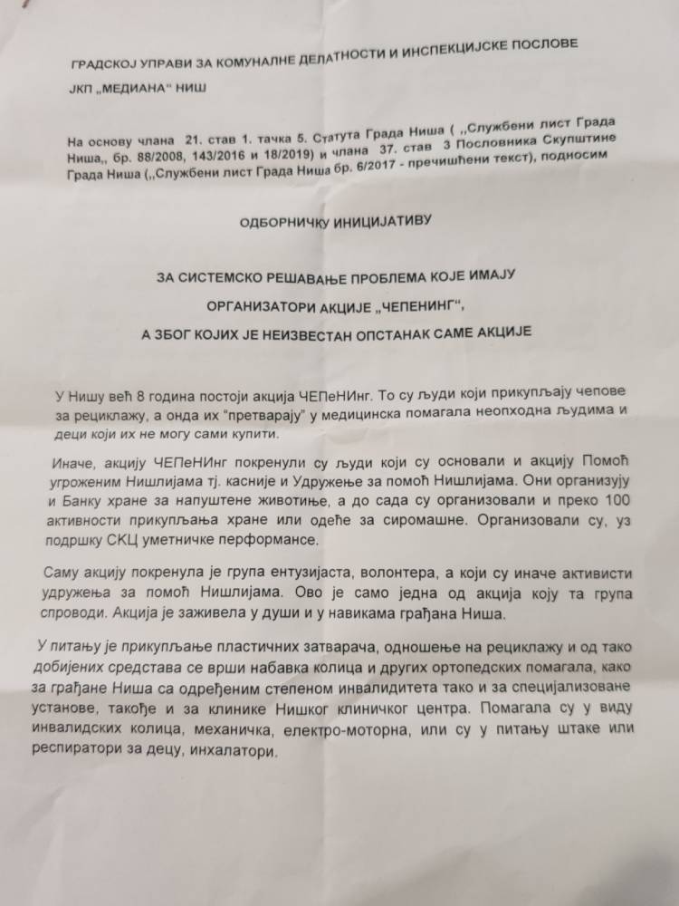 Iako se svakoga meseca prikupi preko jedne tone čepova, od čije reciklaže se kupuju invalidska kolica, organizator Vojkan Živković naglašava da je akcija “Čepining” neizvesna, jer posle 8 godina i dalje jednokratno dobijaju kamione kojima će čepove prevoziti na reciklažu, te smatra da bi nadležni iz Grada Niša trebalo da “progledaju” i shvate važnost humanitarne akcije.