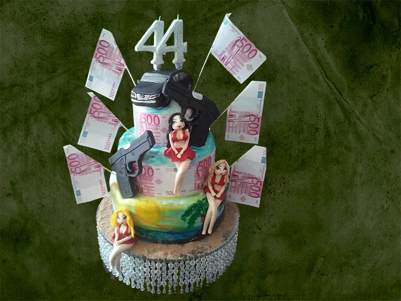 Fotografija rođendanske torte ukrašene pištoljima, novčanicama od 500 evra, figurama golišavih devojaka i crnom limuzinom širi se internetom.