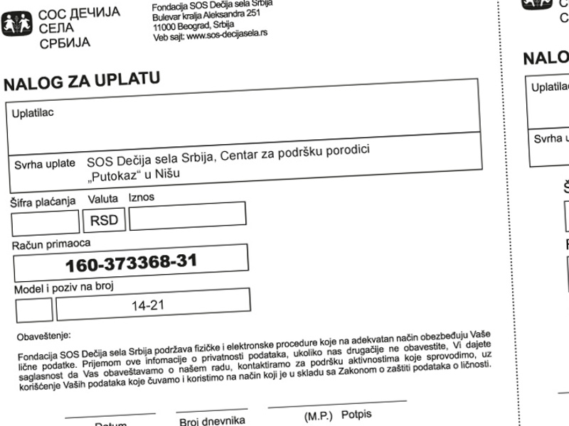 Nišlije će i ove godine uz novembarske račune Objedinjene naplate dobiti i uplatnicu organizacije „SOS dečija sela“ kojom, ukoliko žele i imaju mogućnost, mogu da uplate donaciju i pomognu deci iz ugroženih porodica pošto će novac biti prosleđen niškom Centru za podršku porodici.