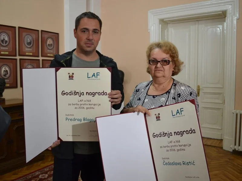 Podsetimo, Predrag Blagojević i Čedoslava Ristić ranije ove godine nagrađeni su Godišnjom nagradom Lokalnog antikorupcijskog foruma. Kako je pisalo u saopštenju, Blagojević je bio nagrađen jer kontinuirano i posvećeno izveštava o temama koje se tiču koruptivnog ponašanja javnih službenika, političara i rukovodilaca, dok je diplomirana pravnica i inspektorka poreske uprave u penziji Čedoslava Ristić “dobila nagradu kao građanka”, jer je ispred Udruženja stanara u “praznoj stolici” u Nadzornom odboru Toplane otkrila i javnosti predočila niz nepravilnosti u radu ovog javnog preduzeća.