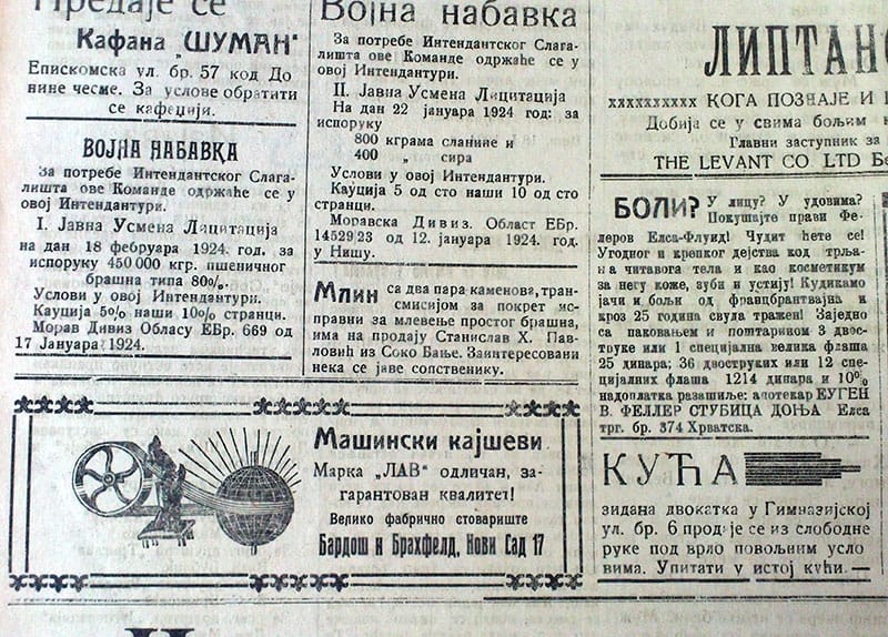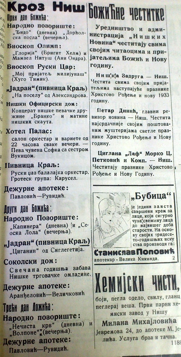 Šta se jelo, pilo, kupovalo, a gde stavljala „ondulacija“ dvadesetih i tridesetih godina prošlog veka, kada je Niš imao „Batine“ cipele, „Lipmanov čaj“ i „Julijo Majnl“, može se videti u novinskim reklamama iz 1924. i 1933. godine.