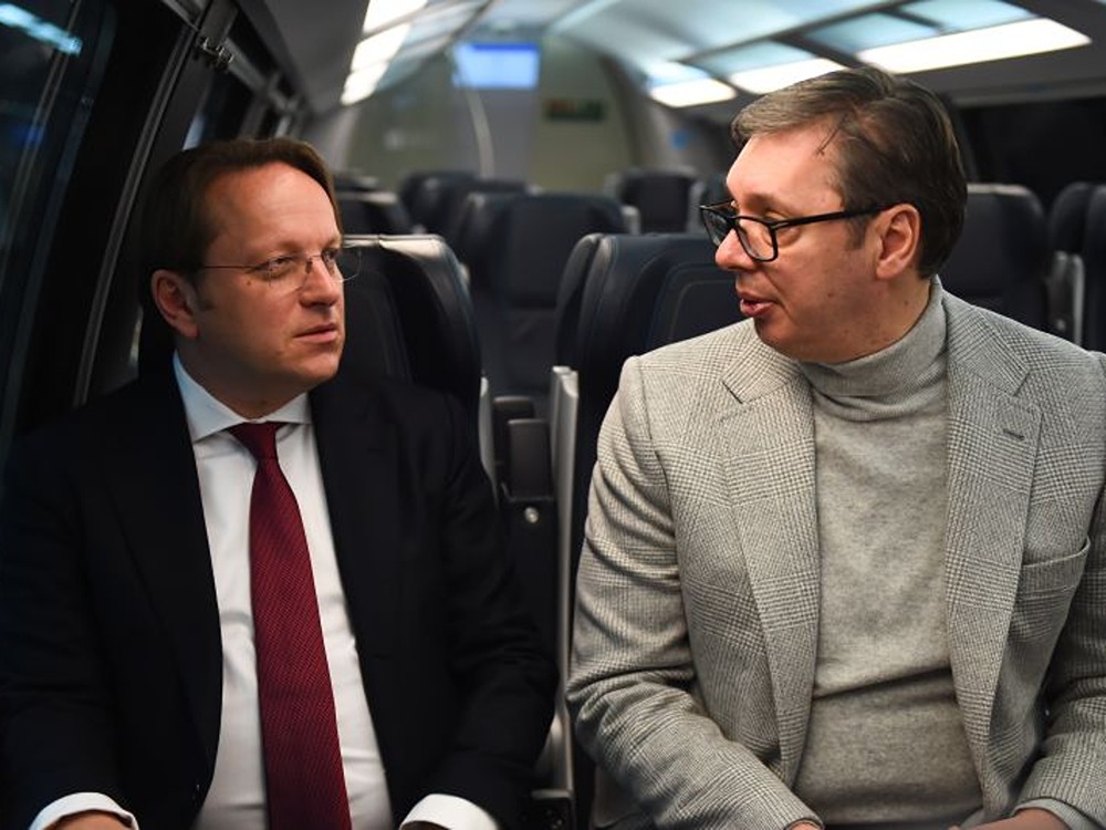 Vučić, ministri u Vladi Srbije, Bragonzi i komesar EU za proširenje i susedstvo Varhelji krenuli su vozom od Železničke stanice u Beogradu, a u Ripnju potpisali grant.