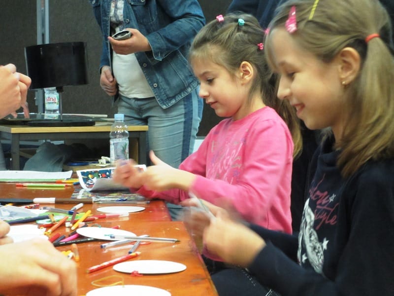 Na štandu o evoluciji foto-aparata najmađi su na dve strane istog kartona sami crtali oblike, a zatim su njihovim brzim okretanjem pomoću gumica stvarali utisak pokretne slike.Osim iz života čuvene Marije Kiri, posetioci su na izložbi „Kosmička traganja“, mogli da vide i fotografije autora Miodraga Sekulića.