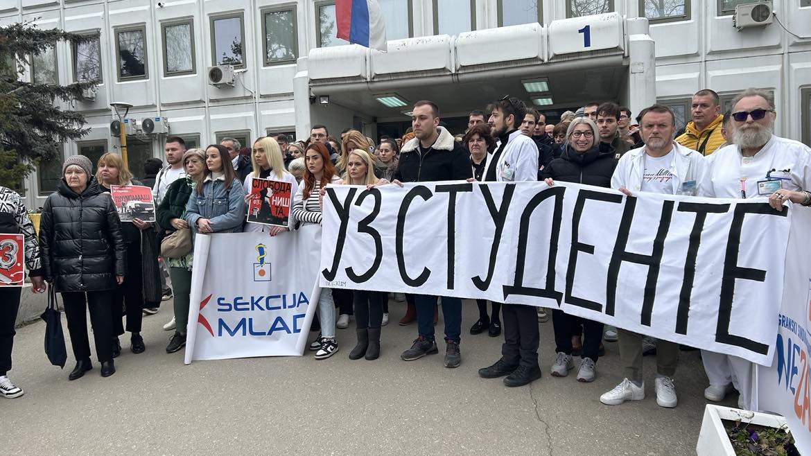 Uz parole “Pumpaj” i “Sve ili NIŠta”, kao i pozivima ostalim kolegama da izađu ispred glavnog ulaza, deo zaposlenih niškog Doma zdravlja i Kliničkog centra zajedno sa studentima Medicnskog fakulteta i ovog petka je pružio podršku studentima i njihovim zahtevima. Kažu da neće tolerisati mobinge, a okupljenima se obratila i medicinska sestra Zavoda za zdravstvenu zaštitu radnika Jelena Popović Nikolić i rekla da je zbog podrške studentima prinuđena da potpiše rešenje o premeštaju.