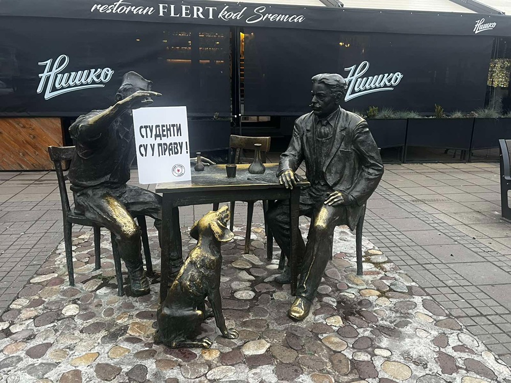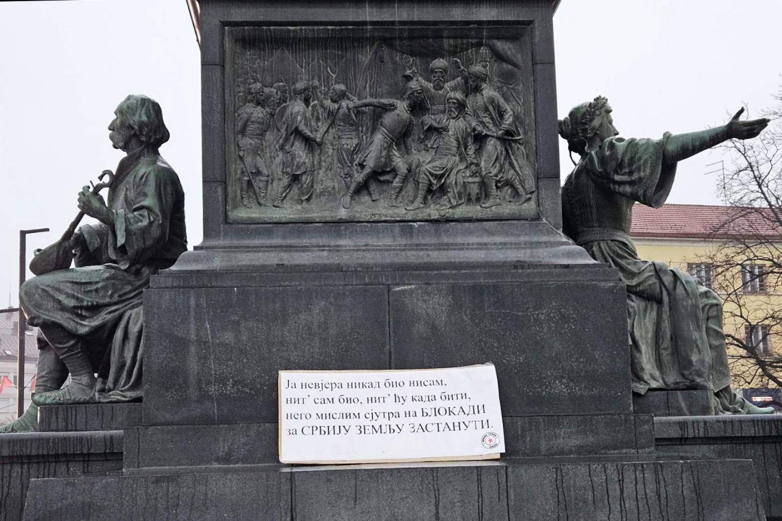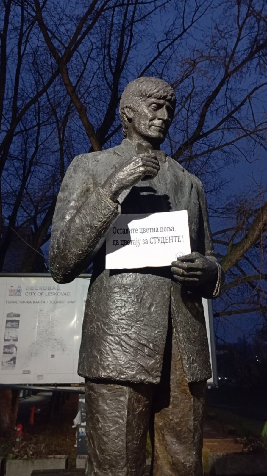 “Ubi nas prejaka diktatura. Bravo, studenti” – poruka je koja se danas našla na spomeniku Branku Miljkoviću ispred Narodnog pozorišta u Nišu. Poruke podrške studentskim blokadama “šalju” brojne druge znamenite ličnosti u Srbiji, a reč je o performansu Urbane gerile Niš.