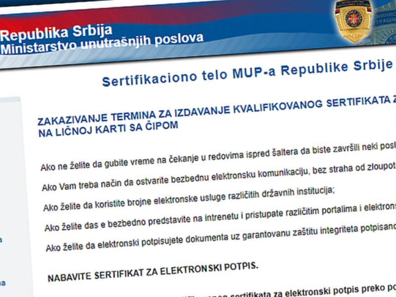 Uputstvo kako da zakažu termin za izdavanje kvalifikovanog sertifikata za elektronski potpis na internet adresi MUP-a građane upućuje na portal eUprave. Međutim, na listi elektronskih usluga koje MUP pruža preko ovog portala nema one za dobijanje ili produženje elektronskog sertifikata.