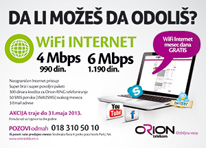 U Orionu do kraja maja WiFi internet brzine 4Mbps možete uzeti po ceni od 990 dinara mesečno, a brzinu od 6Mbps po ceni od 1.190 dinara mesečno. Za oba paketa jedan mesec je gratis!