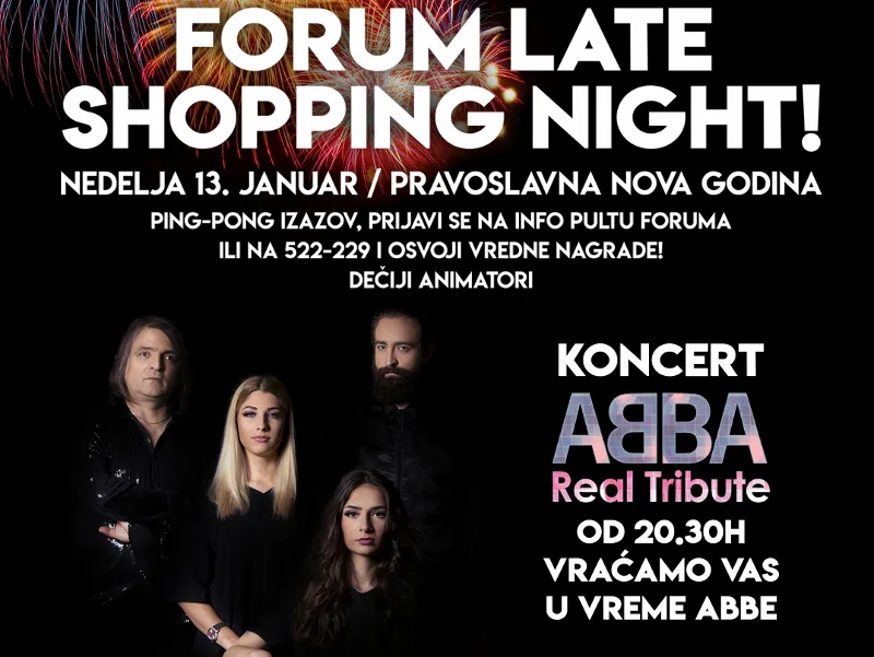 Pored primamljivih popusta do 50 %, Nišlije će tradicionalno imati priliku da uživaju u besplatnom koncertu na platou ispred centra. Ovoga puta, nešto sasvim drugačije! Za dobro raspoloženje u Obrenovićevoj ulici biće zadužen ABBA Real tribute band, koji će na bini ispred Foruma održati 120-minutni nastup sa početkom u 20:30. Vraćamo vas u vreme kada je ABBA stvarala sjajnu muziku! – kažu u Forumu.