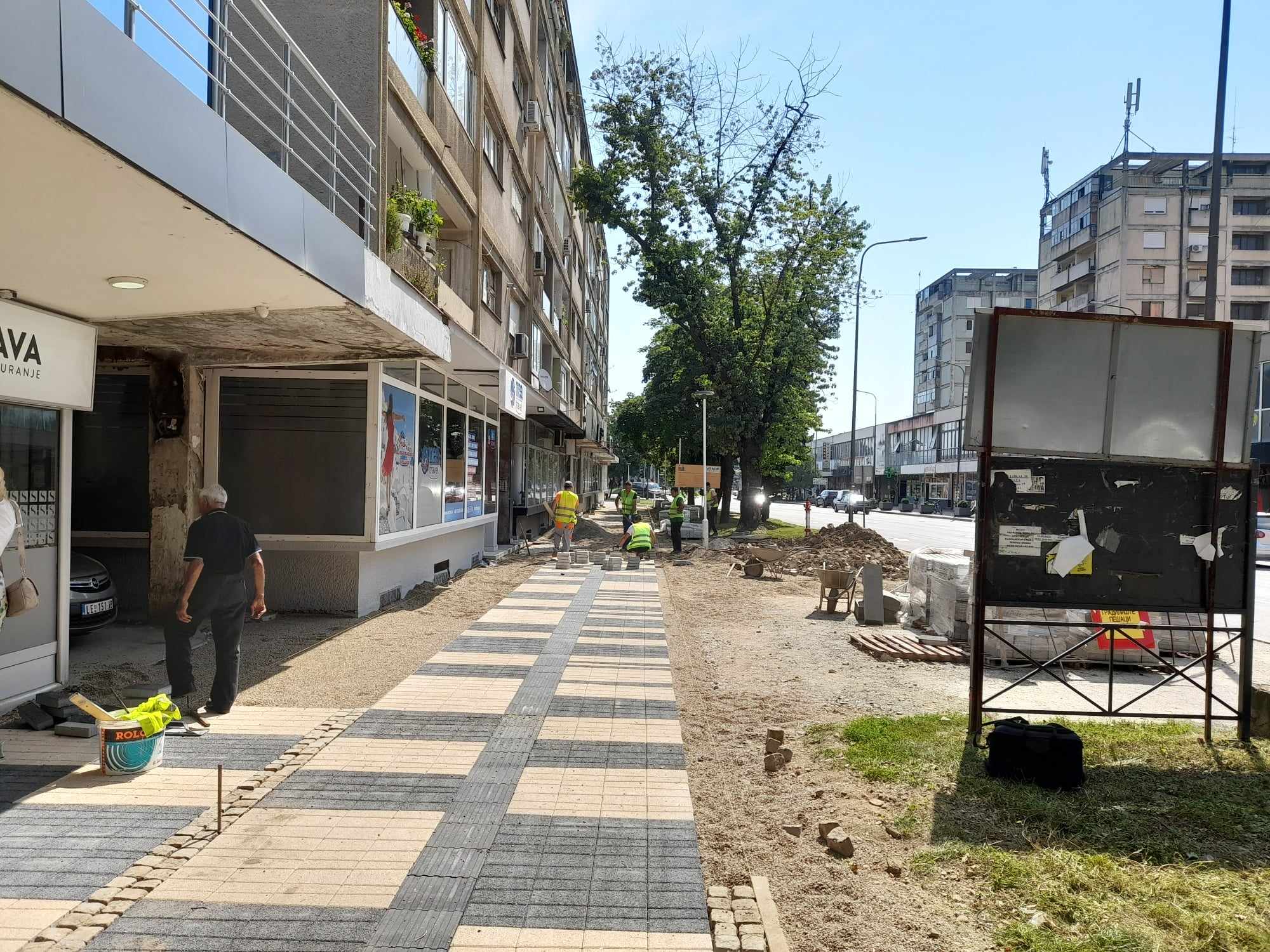 Radi se mašinski iskop, skidanje asfaltnih i betonskih površina, izgradnja tampona od šljunka i tucanika, kamene sitneži i na kraju ugradnja behaton ploča. Isti je materijal kao i na delovima gde je trotar već uređen, a sada se radovi izvode na 2.300 kvadratnih metara. Plan je da radovi budu završeni za 100 dana, ali to će zavisiti od radova na toplovodu. Za sada nema nikakih problema – rekao je Nikolić.