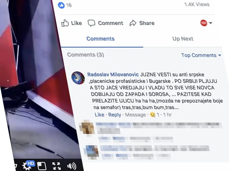 „JUZNE VESTI su anti srpske ,placenicke profasisticke i Bugarske . PO SRBIJI PLJUJU A STO JACE VREDJAJU I VLADU TO SVE VISE NOVCA DOBIJAJU OD ZAPADA I SOROSA, … PAZITESE KAD PRELAZITE ULICU ha ha ha,(mozda ne prepoznajete boje na semafor) tras,tras,bum bum,tras…“,