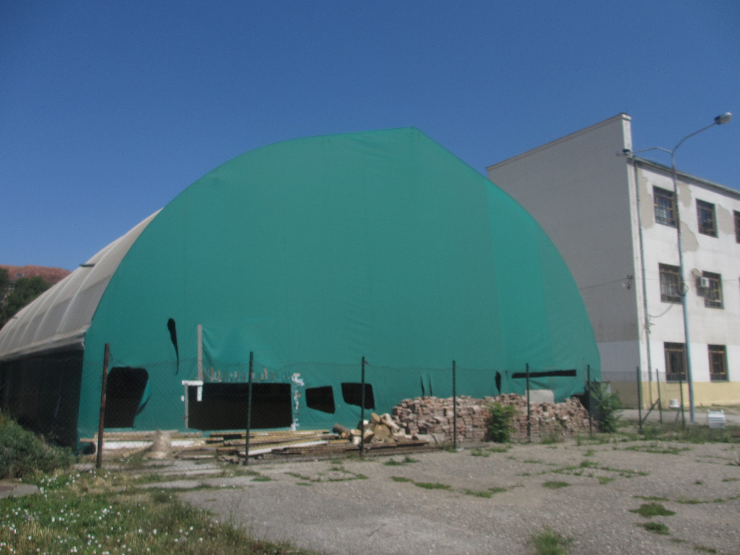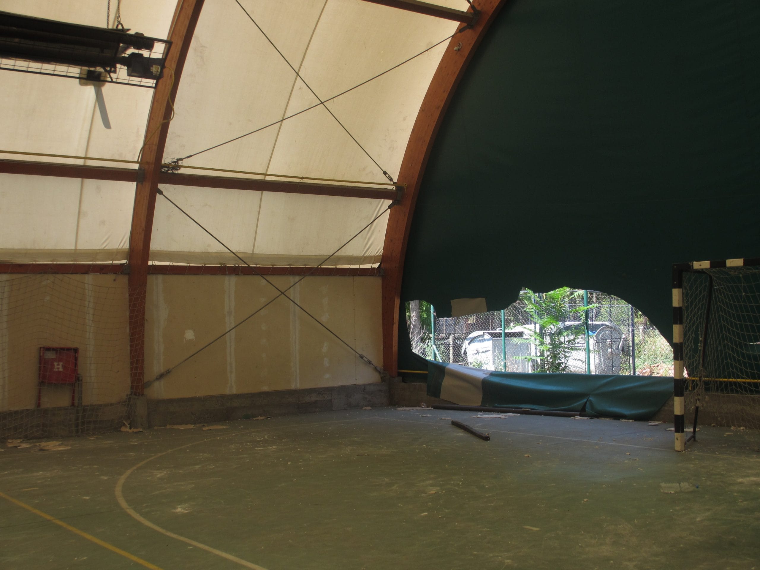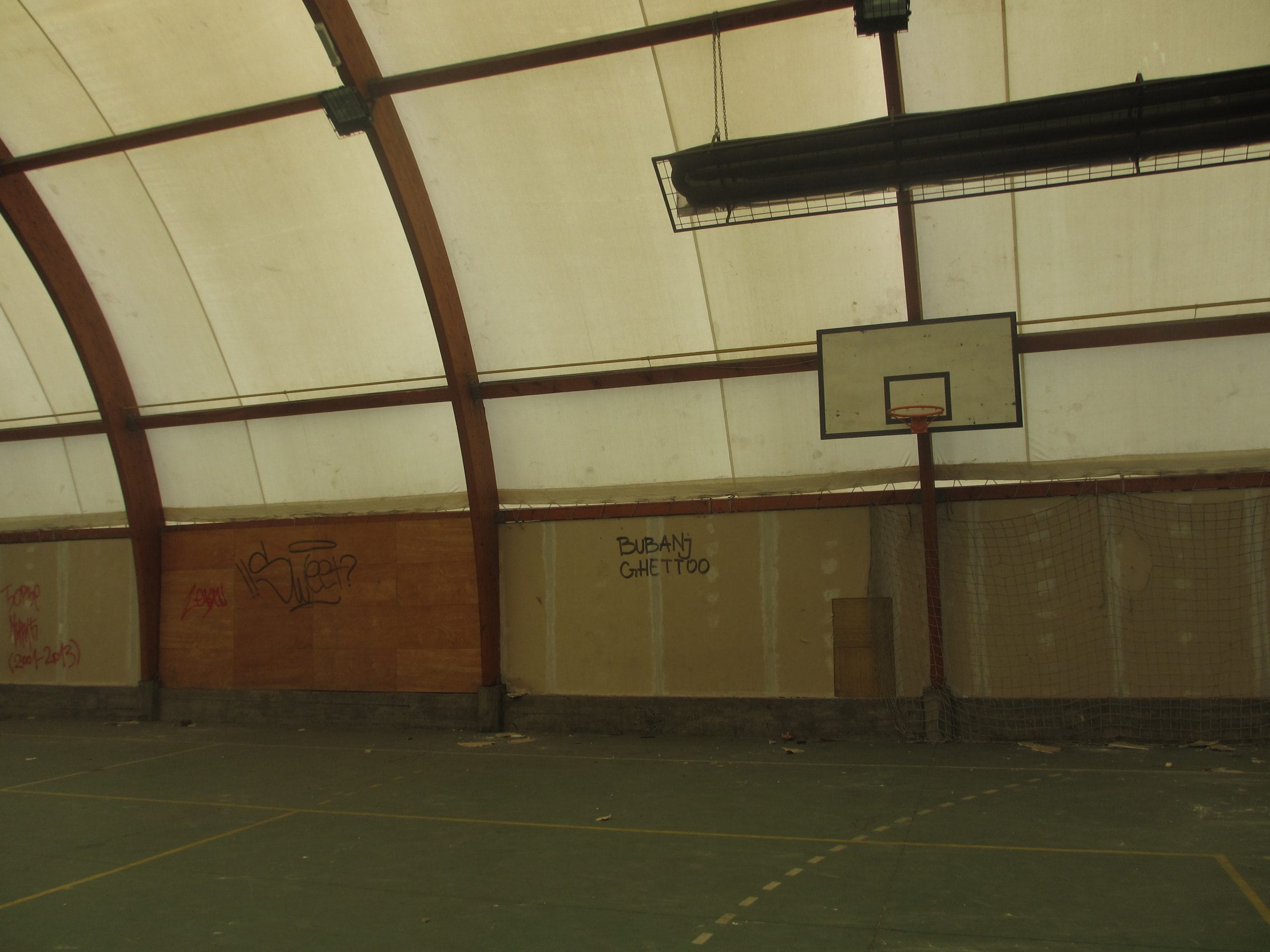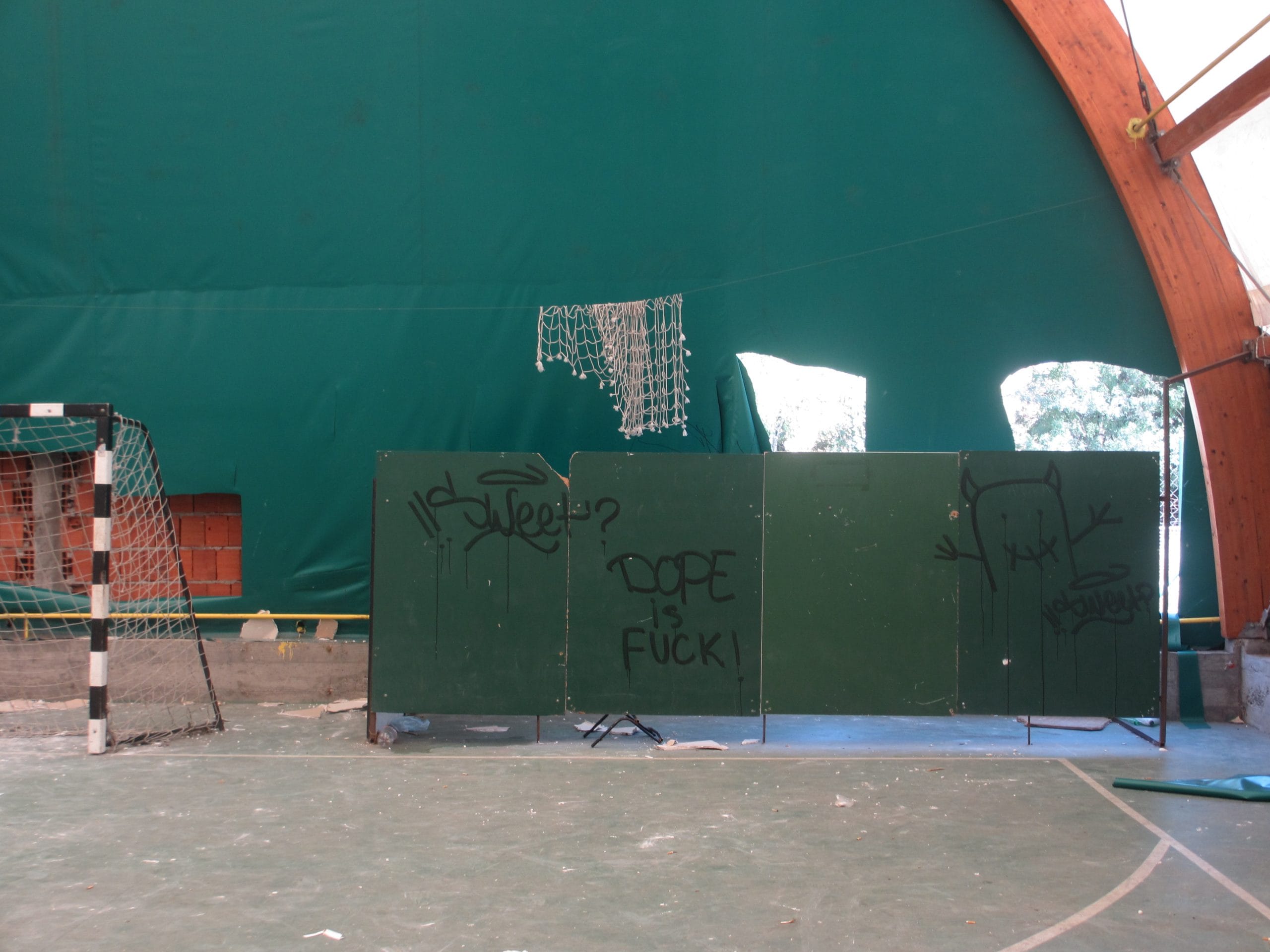 Cerada balon sale je isečena na mnogo mesta, a nekoliko parčeta je potpuno odstranjeno, pa su na zidovima i velike rupe. Osim toga, unutra su ispisani grafiti, slomljeni predmeti, a jedna školska klupa je čak završila u košu.