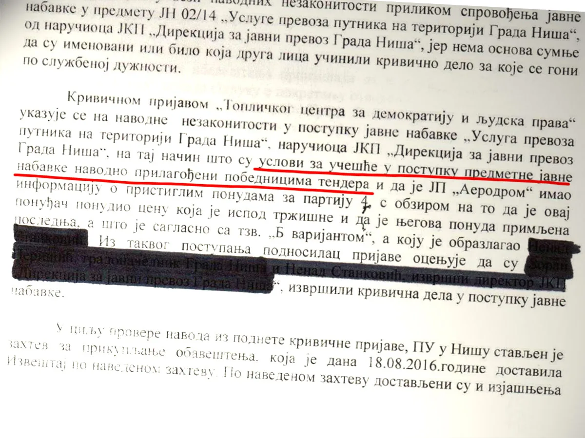 U službenoj belešci koju je potpisao zamenik Višeg javnog tužioca Ivan Simonović se ni jednom jedinom rečju ne pominju snimci koje su Južne vesti objavile septembra 2014. godine, na kojima se čuje kako tadašnji gradonačelnik Zoran Perišić i izvršni direktor Direkcije za javni prevoz Nenad Stanković objašnjavaju svojim saradnicima razloge za određene kriterijume iz teksta tendera koji je tek trebalo da bude raspisan.