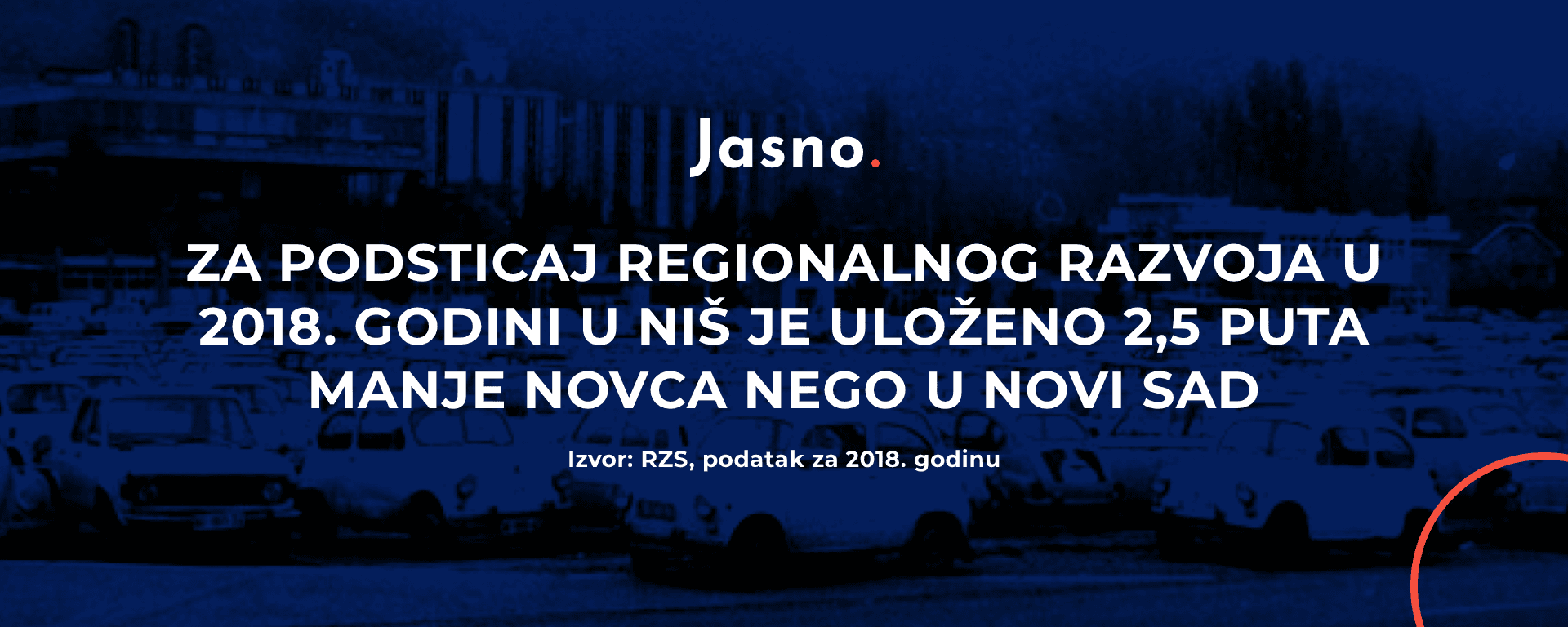 Za podsticaj regionalnog razvoja u 2018. godini uloženo je 70,5 miliona evra u Novi Sad i 28,3 miliona evra u Niš — 2,5 puta manje!Ako posmatramo podsticaj regionalnom razvoju po glavi stanovnika, taj iznos je gotovo duplo veći u Novom Sadu nego u Nišu — 197 evra po stanovniku naspram 110 evra u Nišu.