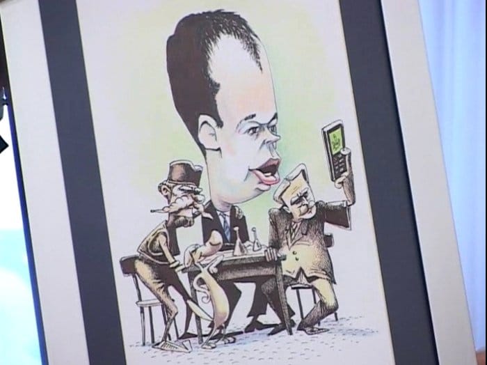 Niški karikaturista je Milošu Simonoviću uručio karikaturu sa likom gradonačelnika Niša.