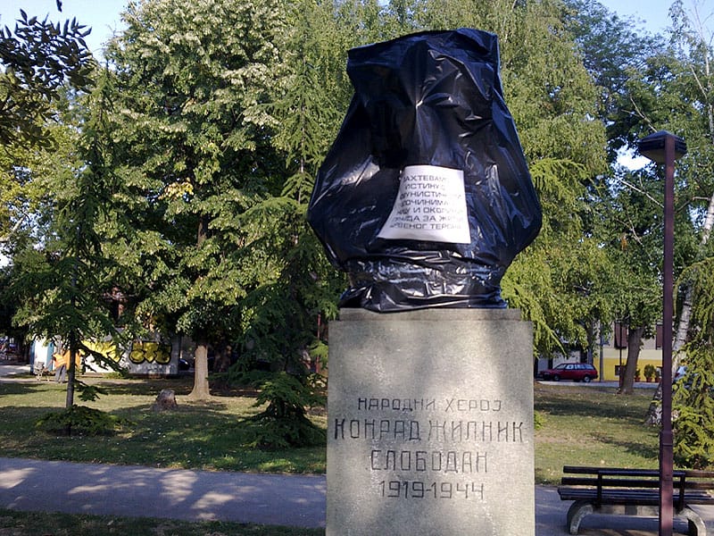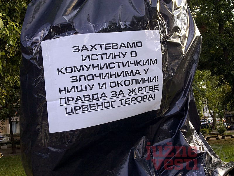 Preko bisti Sretena Mladenovića Mike i Konrada Žilnika i spomenika posvećenom vojnicima poginulim u Drugom svetskom ratu, navučene su „đubrarske“ kese i ispisana poruka „Zahtevamo istinu o komunističkim zločinima u Nišu i okolini! Pravda za žrtve crvenog terora!“.