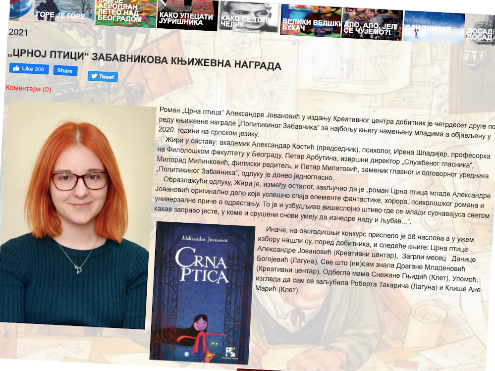 Književna nagrada „Politikinog zabavnika“ za najbolju knjigu namenjenu mladima ponovo je u rukama mladog autora sa juga Srbije, a za 2020. godinu priznanje je dobila Aleksandra Jovanović iz Vranja za roman Crna ptica.